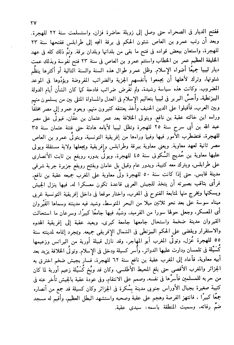 وبعد أن رتب عمرو بن العاص شئون الحكم فى برقة اتجه إلى طرابلس ففتحها سنة 23 للهجرة، واستعان ببعض قواده فى فتح ما بقى من بلدانها وبلدان برقة. وتمّ ذلك كله فى عهد الخليفة العظيم عمر بن الخطاب واستتم عمرو بن العاص فى سنة 23 فتح نفوسة وبذلك عمت ديار ليبيا جميعا أضواء الإسلام. وظل عمرو طوال هذه السنة والسنة التالية أو أكثرها ينظّم شئونها، وترك لأهلها أن يجمعوا بأنفسهم الجزية والضرائب المفروضة ويؤدّوها فى الموعد المضروب. وكانت هذه سياسة رشيدة، ولم تفرض ضرائب فادحة كما كان الشأن أيام الدولة البيزنطية، وأحسّ البربر فى ليبيا بتعاليم الإسلام فى العدل والمساواة المثلى بين من يسلمون منهم وبين العرب، فأقبلوا على الدين الحنيف وأخذ يعتنقه كثيرون منهم. ويعود عمرو إلى مصر مخلفا وراءه ابن خالته عقبة بن نافع. ويتولى الخلافة بعد عمر عثمان بن عفّان، فيولّى على مصر عبد الله بن أبى سرح سنة 25 للهجرة وتظل ليبيا لأيامه هادئة حتى فتنة عثمان سنة 35 للهجرة، فتضطرب الأمور فيها وفيما وراءها من إفريقية التونسية، ويتولّى عمرو بن العاص مصر ثانية لعهد معاوية. ويعنى معاوية ببرقة وطرابلس وإفريقية ويجعلها ولاية مستقلة ويولى عليها معاوية بن حديج السّكونى سنة 45 للهجرة، ويولّى بدوره رويفع بن ثابت الأنصارى على طرابلس، ويترك معه كتيبة، ويدور عام وقيل بل عامان ويفتح رويفع جزيرة جربة شرقى مدينة قابس. حتى إذا كانت سنة 50 للهجرة ولّى معاوية على المغرب جميعه عقبة بن نافع، فرأى بثاقب بصيرته أن يتخذ للجيش العربى قاعدة تكون معسكرا له، فيها ينزل الجيش ويسكنها ويخرج منها لمتابعة الفتوح فى المغرب، واختار موقعا فى داخل إفريقية التونسية غربى ميناء سوسة على بعد نحو ثلاثين ميلا من البحر المتوسط، وشيد فيه مدينته وسماها القيروان أى المعسكر، وجعل حولها سورا من القرميد، وشيّد فيها جامعا كبيرا، وسرعان ما استحالت القيروان مدينة ضخمة واستحال جامعها جامعة كبرى، ويعيد عقبة إلى إفريقية الهدوء والاستقرار ويقضى على الحكم البيزنطى فى الشمال الإفريقى جميعه. وبمجرد إتمامه لمدينته سنة 55 للهجرة عزل، وتولّى المغرب أبو المهاجر، وقد نازل قبيلة أوربة من البرانس وزعيمها كسيلة فى تلمسان ودارت عليها الدوائر، وأسر كسيلة ودخل فى الإسلام. وتولّى الخلافة يزيد بعد أبيه معاوية، فأعاد إلى المغرب عقبة بن نافع سنة 62 للهجرة، فسار بجيش ضخم اخترق به الجزائر والمغرب الأقصى حتى بلغ المحيط الأطلسى، وكان قد وبّخ كسيلة زعيم أوربة لما كان من حربه للمسلمين فأسرّها فى نفسه، وصمم على الانتقام، وفى عودة عقبة بالجيش تأخر عنه فى كتيبة صغيرة بجبال الأوراس جنوبى مدينة بسكرة فى الجزائر وكان كسيلة قد جمع من أنصاره جمعا كبيرا، فانتهز الفرصة وهجم على عقبة وصحبه واستشهد البطل العظيم، وأقيم له مسجد ضمّ رفاته، وسميت المنطقة باسمه: سيدى عقبة.