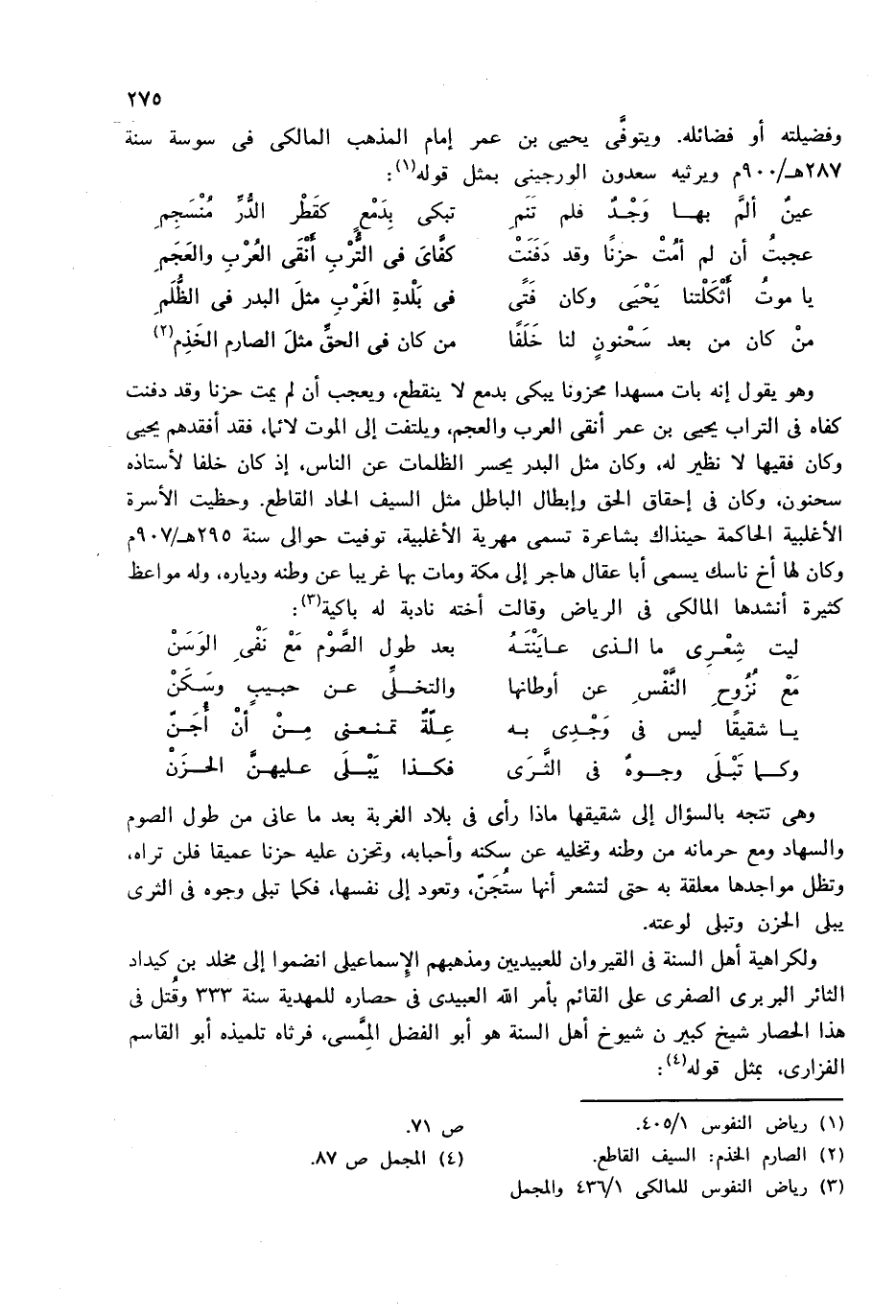 وفضيلته أو فضائله. ويتوفّى يحيى بن عمر إمام المذهب المالكى فى سوسة سنة 287 هـ/900 م ويرثيه سعدون الورجينى بمثل قوله (¬1):