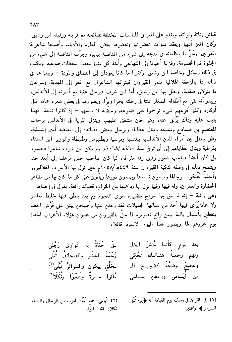 قبائل زناتة ولواتة، ويغدو على المعز فى المناسبات المختلفة بمدائحه مع قرينه ورفيقه ابن رشيق، وكان المعز أديبا ويعقد ندوات يحضرانها ويحضرها بعض العلماء والأدباء، وأصبحا شاعرية المقربين، وجرّ ما ينظمانه فى مديحه إلى شئ من المنافسة بينهما، وجرّت المنافسة إلى شئ من الجفوة ثم الخصومة، وفزعا أحيانا إلى التهاجى وأخذ كل منهما يتعقب سقطات صاحبه، ويكتب فى ذلك رسائل وخاصة ابن رشيق. وكثيرا ما كانا يعودان إلى التصافى والمودة-وبينما هم فى ذلك إذا بالزحفة الهلالية تدمر القيروان فيتركها الشاعران مع المعز إلى المهدية، وسرعان ما ينزلان صقلية، ويظل بها ابن رشيق، أما ابن شرف فيرحل عنها مع أسرته إلى الأندلس، ويبدو أنه لقى مع أطفاله الصغار عنتا فى رحلته بحرا وبرّا، ويصورهم فى بعض شعره حماما ضلّ أوكاره وكلما أفزعهم شئ تزاحموا على ضلوعه، وحضنه لا يسعهم-إذ كانوا تسعة، فهذا يثبت عليه وذاك يزلق عنه، وهو حان مشفق عليهم. وينزل المرية فى الأندلس برحاب المعتصم بن صمادح ويمتدحه وينال عطاياه ويرسل ببعض قصائده إلى المعتضد أمير إشبيلية، وظل ينتقل بين أمراء المدن الأندلسية ببلنسية ومرسية وبطليوس وطليطلة والوزير ابن السقاء بقرطبة وينال عطاياهم إلى أن توفى سنة 460 هـ/1068 م. ولم يكن ابن شرف شاعرا فحسب، بل كان أيضا صاحب شعور رقيق رقة مفرطة، كما كان صاحب حس مرهف إلى أبعد حد، ويتضح ذلك فى وصفه لنكبة القيروان سنة 449 هـ/1058 م حين نزل بها الأعراب الهلاليون، وأخذوا يفتكون برجالها ويسبون نساءها ويهدمون دورها ويأتون على كل ما كان بها من مظاهر الحضارة والعمران، وله فيها وفيما نزل بها وداهمها من الخراب قصائد رائعة، يقول فى إحداها- وهى رائية-إنه لم يبق بها سراج مضئ سوى النجوم ولم يعد ينطق فيها خليط معاشر ولا عاد يرى فيها أحد من نسائها الجميلات فقد رحلن عنها وأصبحن يبتن على فرش الحصا يتغطين بأسمال بالية. ومن رائع تصويره لما حلّ بالقيروان من عدوان هؤلاء الأعراب الجفاة يوم غزوهم لها ويصور هذا اليوم الأسود قائلا: