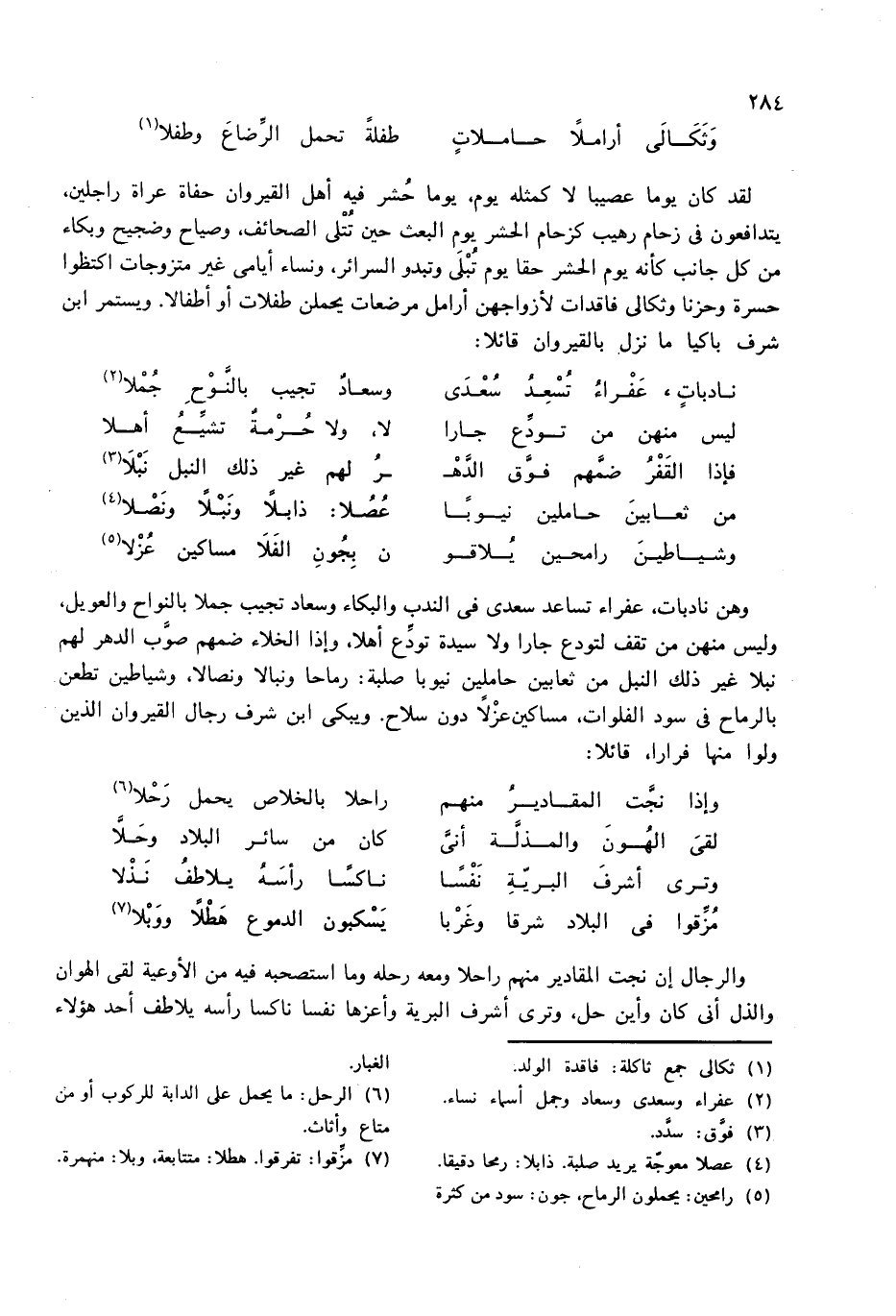 وهن نادبات، عفراء تساعد سعدى فى الندب والبكاء وسعاد تجيب جملا بالنواح والعويل، وليس منهن من تقف لتودع جارا ولا سيدة تودّع أهلا، وإذا الخلاء ضمهم صوّب الدهر لهم نبلا غير ذلك النبل من ثعابين حاملين نيوبا صلبة: رماحا ونبالا ونصالا، وشياطين تطعن بالرماح فى سود الفلوات، مساكين عزلا دون سلاح. ويبكى ابن شرف رجال القيروان الذين ولوا منها فرارا، قائلا:
