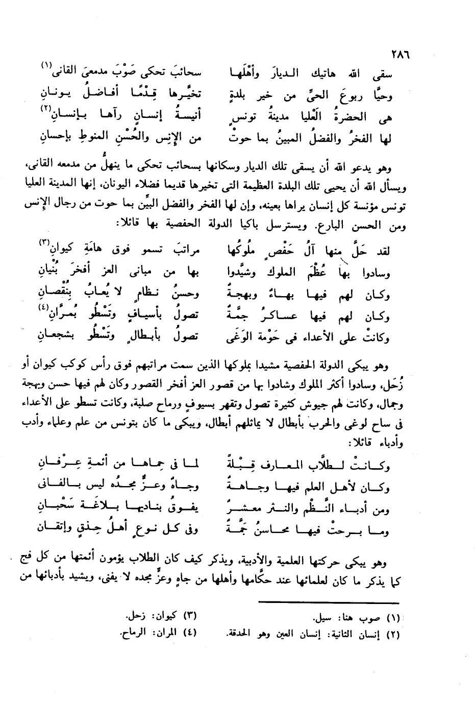 وهو يدعو الله أن يسقى تلك الديار وسكانها بسحائب تحكى ما ينهلّ من مدمعه القانى، ويسأل الله أن يحيى تلك البلدة العظيمة التى تخيرها قديما فضلاء اليونان، إنها المدينة العليا تونس مؤنسة كل إنسان يراها بعينه، وإن لها الفخر والفضل البيّن بما حوت من رجال الإنس ومن الحسن البارع. ويسترسل باكيا الدولة الحفصية بها قائلا: