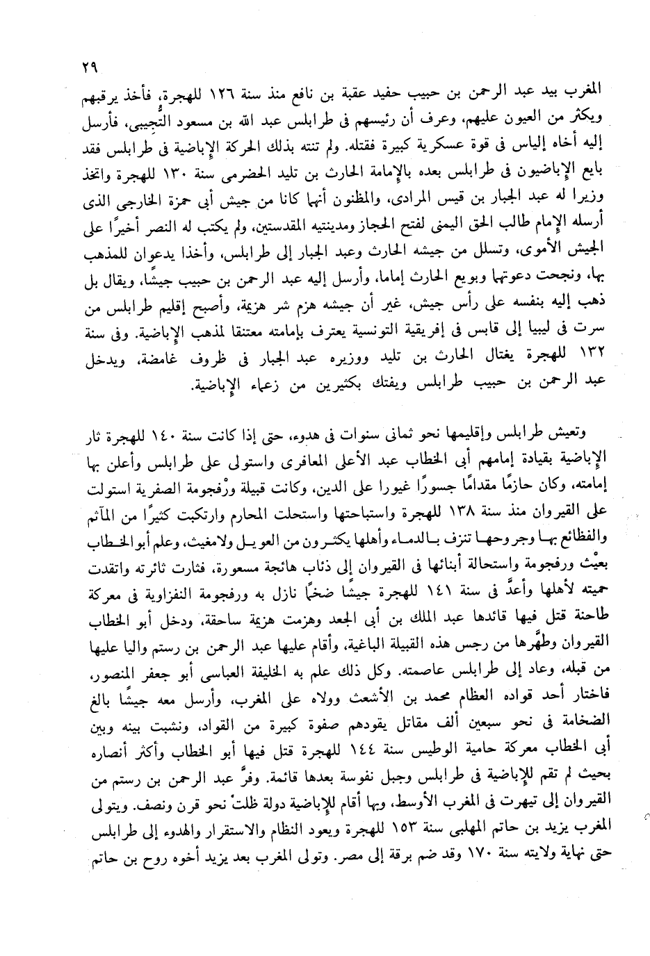 وتعيش طرابلس وإقليمها نحو ثمانى سنوات فى هدوء، حتى إذا كانت سنة 140 للهجرة ثار الإباضية بقيادة إمامهم أبى الخطاب عبد الأعلى المعافرى واستولى على طرابلس وأعلن بها إمامته، وكان حازما مقداما جسورا غيورا على الدين، وكانت قبيلة ورفجومة الصفرية استولت على القيروان منذ سنة 138 للهجرة واستباحتها واستحلت المحارم وارتكبت كثيرا من المآثم والفظائع بها وجروحها تنزف بالدماء وأهلها يكثرون من العويل ولا مغيث، وعلم أبو الخطاب بعيث ورفجومة واستحالة أبنائها فى القيروان إلى ذئاب هائجة مسعورة، فثارت ثائرته واتقدت حميته لأهلها وأعدّ فى سنة 141 للهجرة جيشا ضخما نازل به ورفجومة النفزاوية فى معركة طاحنة قتل فيها قائدها عبد الملك بن أبى الجعد وهزمت هزيمة ساحقة، ودخل أبو الخطاب القيروان وطهّرها من رجس هذه القبيلة الباغية، وأقام عليها عبد الرحمن بن رستم واليا عليها من قبله، وعاد إلى طرابلس عاصمته. وكل ذلك علم به الخليفة العباسى أبو جعفر المنصور، فاختار أحد قواده العظام محمد بن الأشعث وولاه على المغرب، وأرسل معه جيشا بالغ الضخامة فى نحو سبعين ألف مقاتل يقودهم صفوة كبيرة من القواد، ونشبت بينه وبين أبى الخطاب معركة حامية الوطيس سنة 144 للهجرة قتل فيها أبو الخطاب وأكثر أنصاره بحيث لم تقم للإباضية فى طرابلس وجبل نفوسة بعدها قائمة. وفرّ عبد الرحمن بن رستم من القيروان إلى تيهرت فى المغرب الأوسط، وبها أقام للإباضية دولة ظلت نحو قرن ونصف. ويتولى المغرب يزيد بن حاتم المهلبى سنة 153 للهجرة ويعود النظام والاستقرار والهدوء إلى طرابلس حتى نهاية ولايته سنة 170 وقد ضم برقة إلى مصر. وتولى المغرب بعد يزيد أخوه روح بن حاتم