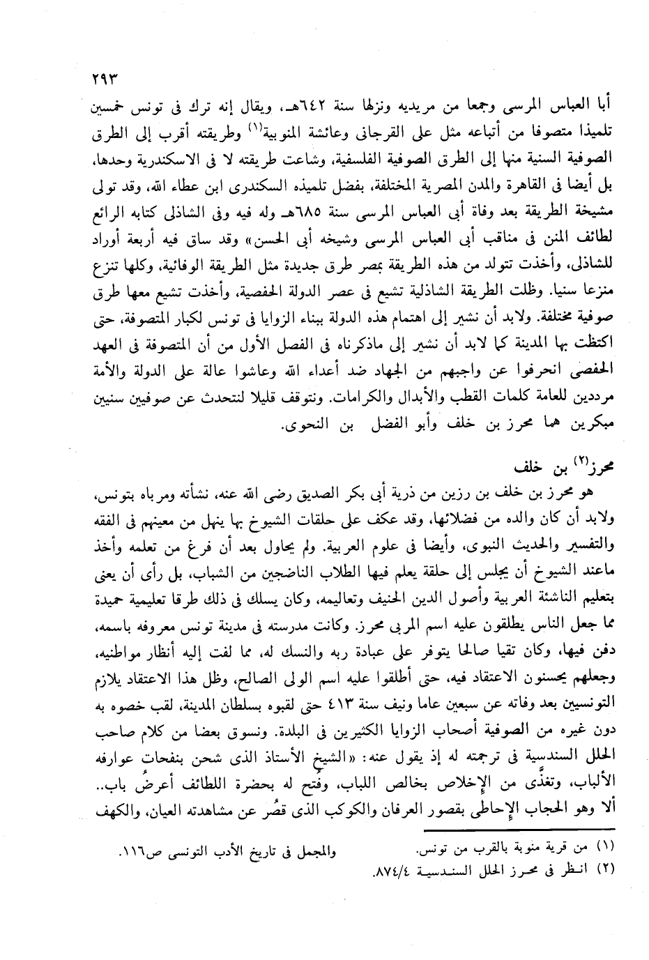 أبا العباس المرسى وجمعا من مريديه ونزلها سنة 642 هـ، ويقال إنه ترك فى تونس خمسين تلميذا متصوفا من أتباعه مثل على القرجانى وعائشة المنوبية (¬1) وطريقته أقرب إلى الطرق الصوفية السنية منها إلى الطرق الصوفية الفلسفية، وشاعت طريقته لا فى الاسكندرية وحدها، بل أيضا فى القاهرة والمدن المصرية المختلفة، بفضل تلميذه السكندرى ابن عطاء الله، وقد تولى مشيخة الطريقة بعد وفاة أبى العباس المرسى سنة 685 هـ وله فيه وفى الشاذلى كتابه الرائع لطائف المنن فى مناقب أبى العباس المرسى وشيخه أبى الحسن» وقد ساق فيه أربعة أوراد للشاذلى، وأخذت تتولد من هذه الطريقة بمصر طرق جديدة مثل الطريقة الوفائية، وكلها تنزع منزعا سنيا. وظلت الطريقة الشاذلية تشيع فى عصر الدولة الحفصية، وأخذت تشيع معها طرق صوفية مختلفة. ولا بد أن نشير إلى اهتمام هذه الدولة ببناء الزوايا فى تونس لكبار المتصوفة، حتى اكتظت بها المدينة كما لا بد أن نشير إلى ما ذكرناه فى الفصل الأول من أن المتصوفة فى العهد الحفصى انحرفوا عن واجبهم من الجهاد ضد أعداء الله وعاشوا عالة على الدولة والأمة مرددين للعامة كلمات القطب والأبدال والكرامات. ونتوقف قليلا لنتحدث عن صوفيين سنيين مبكرين هما محرز بن خلف وأبو الفضل بن النحوى.
