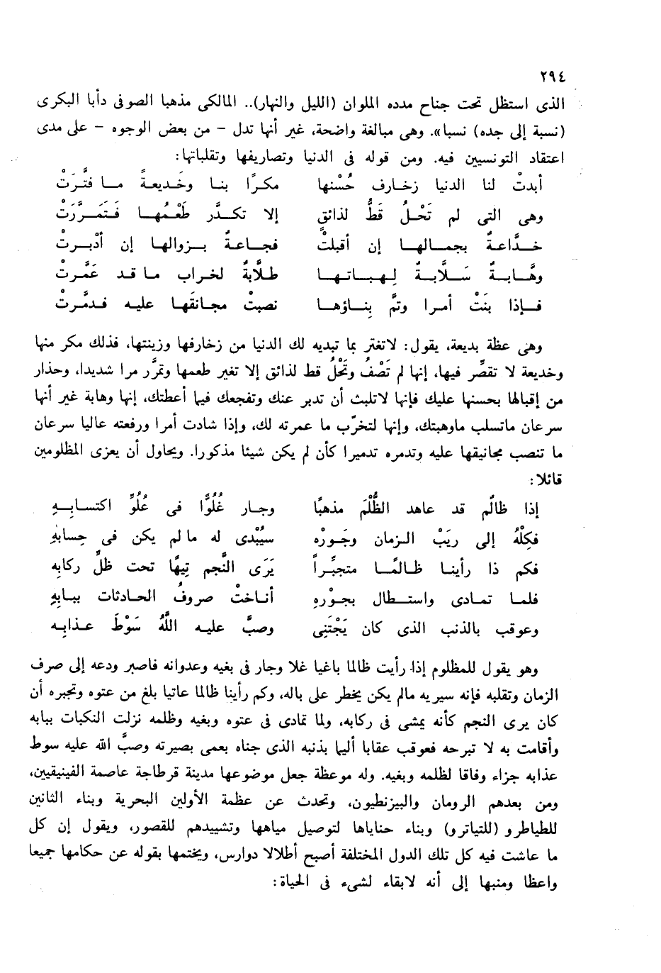 الذى استظل تحت جناح مدده الملوان (الليل والنهار). . المالكى مذهبا الصوفى دأبا البكرى (نسبة إلى جده) نسبا». وهى مبالغة واضحة، غير أنها تدل-من بعض الوجوه-على مدى اعتقاد التونسيين فيه. ومن قوله فى الدنيا وتصاريفها وتقلباتها: