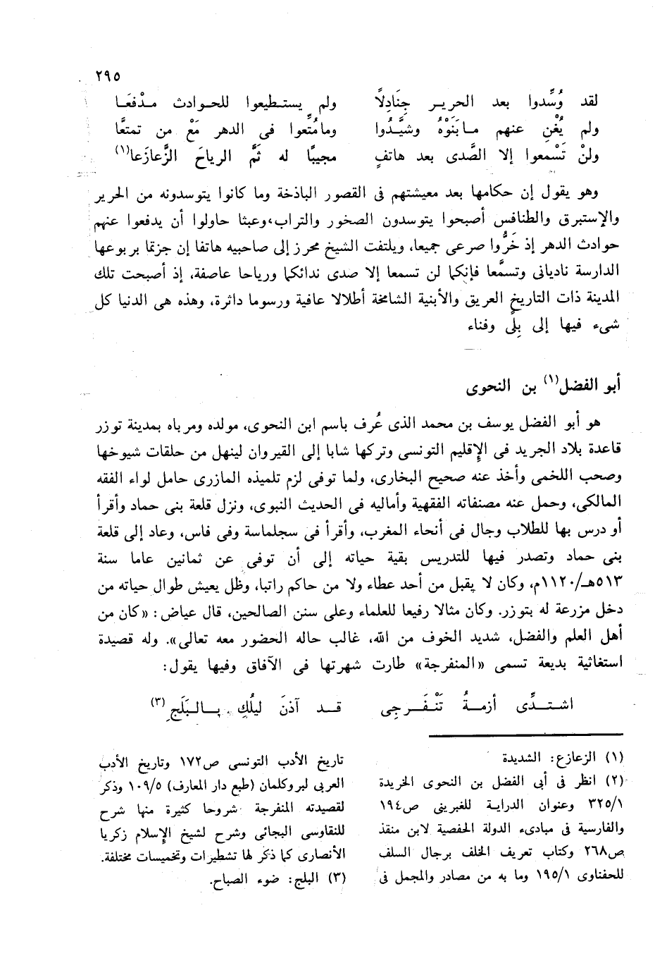 (¬2) انظر فى أبى الفضل بن النحوى الخريدة 1/ 325 وعنوان الدراية للغبرينى ص 194 والفارسية فى مبادئ الدولة الحفصية لابن منقذ ص 268 وكتاب تعريف الخلف برجال السلف للحفناوى 1/ 195 وما به من مصادر والمجمل فى تاريخ الأدب التونسى ص 172 وتاريخ الأدب العربى لبروكلمان (طبع دار المعارف) 5/ 109 وذكر لقصيدته المنفرجة شروحا كثيرة منها شرح للنقاوسى البجائى وشرح لشيخ الإسلام زكريا الأنصارى كما ذكر لها تشطيرات وتخميسات مختلفة.