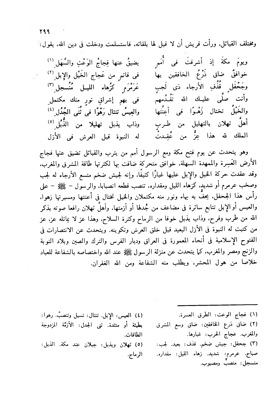وهو يتحدث عن يوم فتح مكة ومع الرسول أمم من يثرب والقبائل تضيق عنها فجاج الأرض العسرة والممهدة السهلة، خوافق متحركة ضاقت بها لكثرتها طاقة المشرق والمغرب، وقد عقدت حركة الخيل والإبل عليها غبارا كثيفا، وإنه لجيش ضخم متسع الأرجاء له لجب وصخب عرمرم أو شديد، كزهاء الليل ومقداره، تنصب قطعه انصبابا، والرسول-صلّى الله عليه وسلّم-على رأس هذا الجحفل، يحفّ به بهاء ونور منه مكتملان والخيل تختال فى أعنتها ومسيرتها زهوا، والعيس أو الإبل تتابع سائرة فى مضاعف من جدلها أو أزمتها، وأهلّ ثهلان رافعا صوته بذكر الله من طرب وفرح، وذاب يذبل خوفا من الرماح وكثرة السلاح، وهذا عز لا يماثله عز، عز من كتبت له النبوة فى الأزل البعيد قبل خلق العرش وتكوينه. ويتحدث عن الانتصارات فى الفتوح الإسلامية فى أنحاء المعمورة فى العراق وديار الفرس والترك والصين وبلاد النوبة والزنج ومصر والمغرب، كما يتحدث عن منزلة الرسول صلّى الله عليه وسلّم عند الله واختصاصه بالشفاعة للعباد خلاصا من هول المحشر، ويطلب منه الشفاعة ومن الله الغفران.