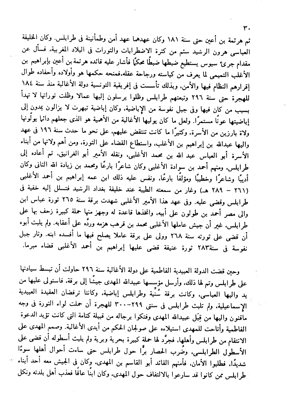 ثم هرثمة بن أعين حتى سنة 181 وكان عهدهما عهد أمن وطمأنينة فى طرابلس. وكان الخليفة العباسى هارون الرشيد سئم من كثرة الاضطرابات والثورات فى البلاد المغربية، فسأل عن مقدام جريء سيوس يستطيع ضبطها ضبطا محكما فأشار عليه قائده هرثمة بن أعين بإبراهيم بن الأغلب التميمى لما يعرف من كياسته ورجاحة عقله، فمنحه حكمها هو وأولاده وأحفاده طوال إقرارهم النظام فيها والأمن، وبذلك تأسست فى إفريقية التونسية دولة الأغالبة منذ سنة 184 للهجرة حتى سنة 296 وتبعتهم طرابلس وظلوا يرسلون إليها عمالا وظلت ثوراتها لا تهدأ بسبب من كان فيها وفى جبل نفوسة من الإباضية، وكان إباضية تيهرت لا يزالون يمدون إلى إباضيتها عونا مستمرا. ولعل ما كان يوليها الأغالبة من الأهمية هو الذى جعلهم دائما يولّونها ولاة بارزين من الأسرة، وكثيرا ما كانت تنتقض عليهم، على نحو ما حدث سنة 196 فى عهد واليها عبد الله بن إبراهيم بن الأغلب، واستطاع القضاء على الثورة، ومن أهم ولاتها من أبناء الأسرة أبو العباس عبد الله بن محمد الأغلبى، ونقله الأمير أبو الغرانيق، ثم أعاده إلى طرابلس، ومنهم أحمد بن سوادة الأغلبى وكان شاعرا بارعا ومحمد بن زيادة الله الثانى وكان أديبا وشاعرا وخطيبا ومؤلفا بارعا، ونفس عليه ذلك ابن عمه إبراهيم بن أحمد الأغلبى (261 - 289 هـ) وغار من سمعته الطيبة عند خليفة بغداد الرشيد فتسلل إليه خفية فى طرابلس وقضى عليه. وفى عهد هذا الأمير الأغلبى شهدت برقة سنة 265 ثورة عباس ابن والى مصر أحمد بن طولون على أبيه، واتخذها قاعدة له وجهز منها حملة كبيرة زحف بها على طرابلس، غير أن جيش عاملها الأغلبى محمد بن قرهب هزمه وردّه على أعقابه. ولم يلبث أبوه أن قضى على ثورته سنة 268 وولى على برقة عاملا يصلح فيها ما أفسده ابنه. وثار جبل نفوسة فى سنة 283 ثورة عنيفة قضى عليها إبراهيم بن أحمد الأغلبى قضاء مبرما.