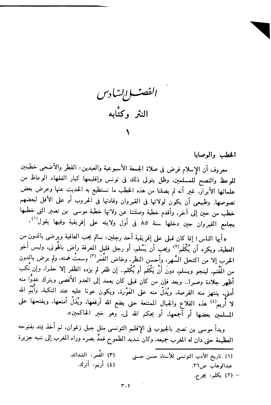 معروف أن الإسلام فرض فى صلاة الجمعة الأسبوعية والعيدين: الفطر والأضحى خطبتين للوعظ والنصح للمسلمين، وظل يتولى ذلك فى تونس وإقليمها كبار الفقهاء الوعاظ من علمائها الأبرار، غير أنه لم يصلنا من هذه الخطب ما نستطيع به الحديث عنها وعرض بعض نصوصها. وطبيعى أن يكون لولاتها فى القيروان وقادتها فى الحروب أو على الأقل لبعضهم خطب من حين إلى آخر، وأقدم خطبة وصلتنا عن ولاتها خطبة موسى بن نصير التى خطبها بجامع القيروان حين دخلها سنة 85 فى أول ولايته على إفريقية وفيها يقول (¬1):