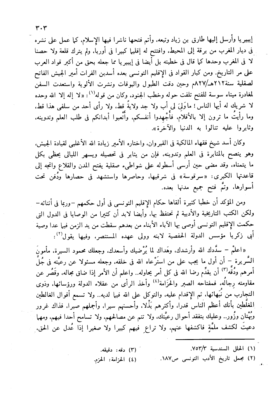 إيبيريا وأرسل إليها طارق بن زياد وتبعه، وأتم فتحها ناشرا فيها الإسلام، كما عمل على نشره فى ديار المغرب من برقة إلى المحيط، وافتتح له إقليما كبيرا فى أوربا، ولم يترك قلعة ولا حصنا لا فى المغرب وحدها كما قال فى خطبته بل أيضا فى إيبيريا مما جعله بحق من أكبر قواد العرب على مر التاريخ. ومن كبار القواد فى الإقليم التونسى بعده أسد بن الفرات أمير الجيش الفاتح لصقلية سنة 212 هـ/827 م وحين دقت الطبول والبوقات ونشرت الألوية واستعدت السفن لمغادرة ميناء سوسة للفتح تلفت حوله وخطب الجنود، وكان من قوله (¬1): «لا إله إلا الله وحده لا شريك له أيها الناس! ما ولى لى أب ولا جد ولاية قط، ولا رأى أحد من سلفى هذا قط، وما رأيت ما ترون إلا بالأقلام، فأجهدوا أنفسكم، وأتعبوا أبدانكم فى طلب العلم وتدوينه، وثابروا عليه تنالوا به الدنيا والآخرة».