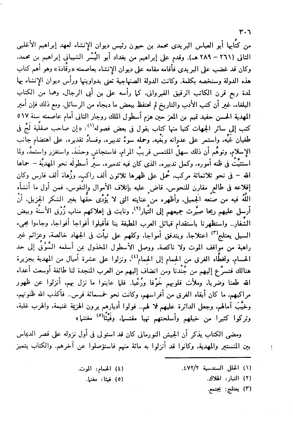 من كتّابها أبو العباس البريدى محمد بن حيون رئيس ديوان الإنشاء لعهد إبراهيم الأغلبى الثانى (261 - 289 هـ). وقدم على إبراهيم من بغداد أبو اليسر الشيبانى إبراهيم بن محمد، وكان قد غضب على البريدى فأقامه مقامه على ديوان الإنشاء بعاصمته «رقّادة» وهو أهم كتاب هذه الدولة وسنخصه بكلمة. وكانت الدولة الصنهاجية تعنى بدواوينها ورأس ديوان الإنشاء بها لمدة ربع قرن الكاتب الرقيق القيروانى، كما رأسه على بن أبى الرجال، وهما من الكتاب البلغاء، غير أن كتب الأدب والتاريخ لم تحتفظ ببعض ما دبجاه من الرسائل. ومع ذلك فإن أمير المهدية الحسن حفيد تميم بن المعز حين هزم أسطول الملك روجار الثانى أمام عاصمته سنة 517 كتب إلى سائر الجهات كتبا منها كتاب يقول فى بعض فصوله (¬1): «إن صاحب صقلّية لجّ فى طغيان غيّه، واستمر على عدوانه وبغيه، وحمله سوء تدبيره، وفساد تقديره، على اهتضام جانب الإسلام، وتوهّم أن ذلك سهل الملتمس قريب المرام، فاستجاش وحشد، واستغزر واستمدّ، ولما استتبّت فى ظنه أموره، وكمل تدبيره، الذى كان فيه تدميره، سيّر أسطوله نحو المهديّة-حماها الله-فى نحو ثلاثمائة مركب، حمل على ظهرها ثلاثون ألف راكب، وزهاء ألف فارس وكان إقلاعه فى طالع مقارن للنحوس، قاض عليه بإتلاف الأموال والنّفوس، فمن أول ما أنشأه الله فيه من صنعه الجميل، وأظهره من عنايته التى لا يؤدّى حقّها بغير الشكر الجزيل، أن أرسل عليهم ريحا صيّرت جميعهم إلى التّبار (¬2)، ونابت فى إهلاكهم مناب زرق الأسنّة وبيض الشّفار. . واستظهرنا باستقدام قبائل العرب المطيفة بنا فأقبلوا أفواجا أفواجا، وجاءوا مجئ السيل يعتلج (¬3) اعتلاجا، ويتدفق أمواجا، وكلهم على نيّات فى الجهاد خالصة، وعزائم غير راهبة من مواقف الموت ولا ناكصة، ووصل الأسطول المخذول بمن أسلمه السّوق إلى حد الحسام، وتخطّاه الغرق من الحمام إلى الحمام (¬4)، ونزلوا على عشرة أميال من المهدية بجزيرة هنالك فتسرّع إليهم من جندنا ومن انضاف إليهم من العرب المنجدة لنا طائفة أوسعت أعداء الله طعنا وضربا، وملأت قلوبهم خوفا ورعبا. فلما عاينوا ما نزل بهم، أنزلوا عن ظهور مراكبهم، ما كان أبقاه الغرق من أفراسهم، وكانت نحو خمسمائة فرس. . فأكذب الله ظنونهم، وخيّب آمالهم، وجعل الدائرة عليهم لا لهم. . فولوا أدبارهم يرون الهزيمة غنيمة، والهرب غلبة، وتركوا كثيرا من خيلهم وأسلحتهم نهبا مقتسما، وفيئا (¬5) مغتنما»