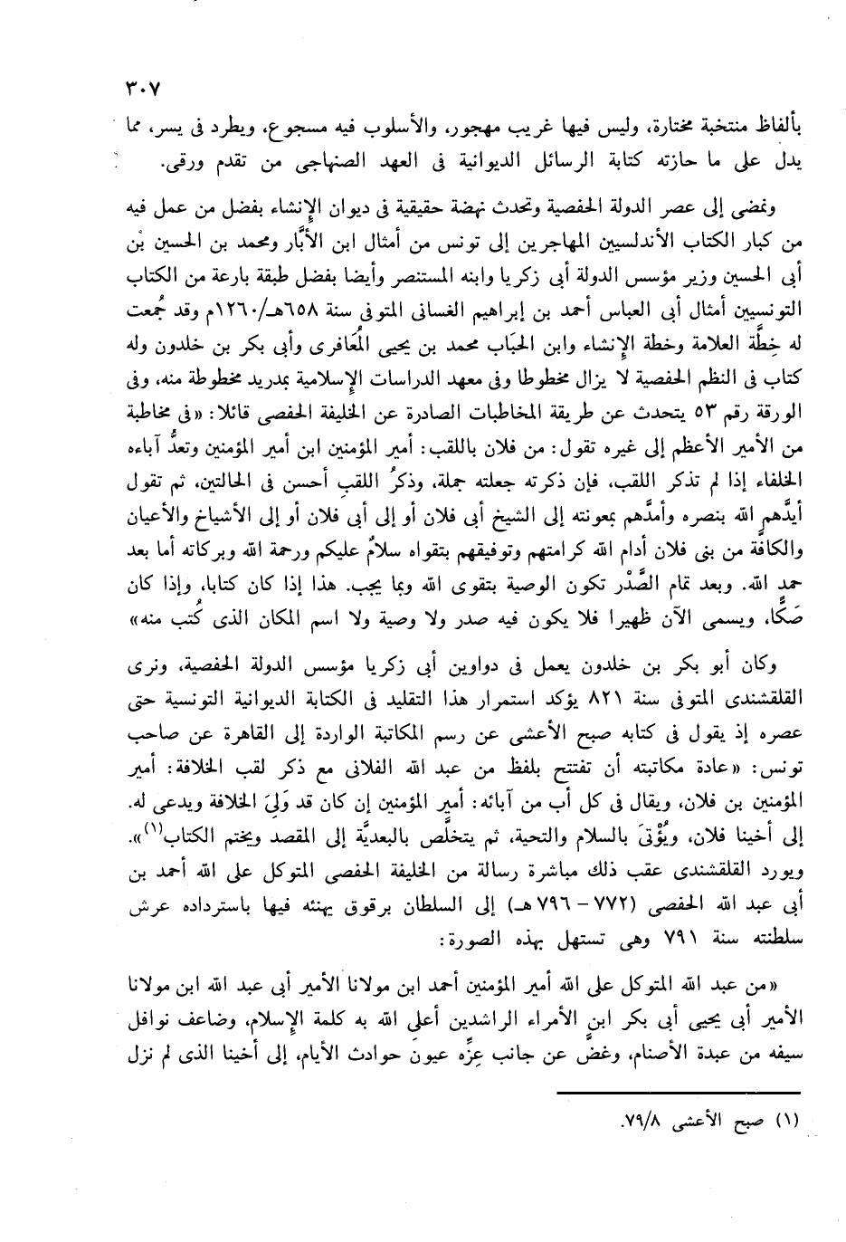 ويورد القلقشندى عقب ذلك مباشرة رسالة من الخليفة الحفصى المتوكل على الله أحمد بن أبى عبد الله الحفصى (772 - 796 هـ) إلى السلطان برقوق يهنئه فيها باسترداده عرش سلطنته سنة 791 وهى تستهل بهذه الصورة: