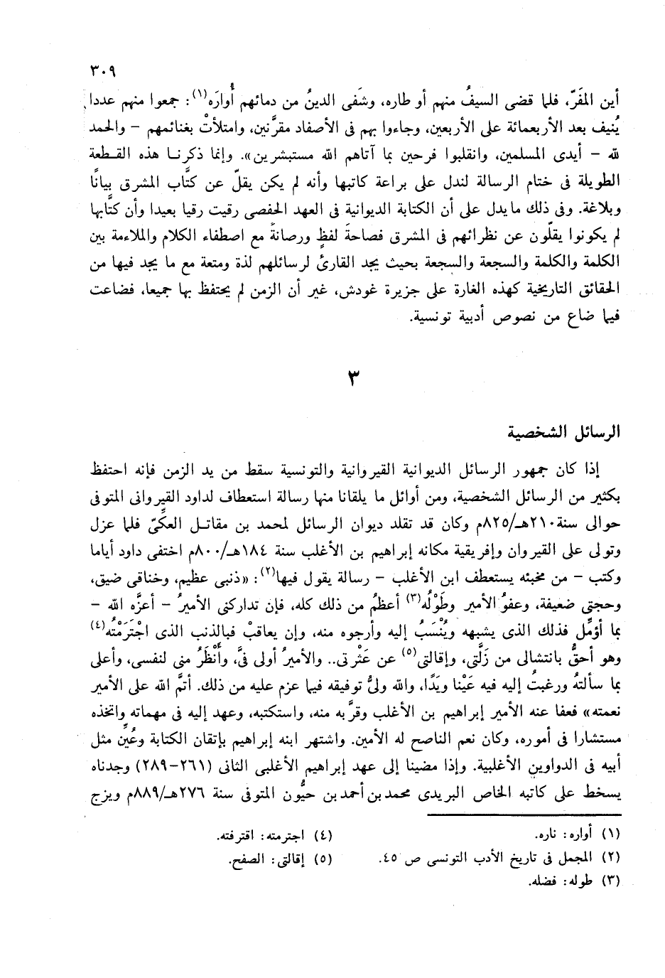 إذا كان جمهور الرسائل الديوانية القيروانية والتونسية سقط من يد الزمن فإنه احتفظ بكثير من الرسائل الشخصية، ومن أوائل ما يلقانا منها رسالة استعطاف لداود القيروانى المتوفى حوالى سنة 210 هـ/825 م وكان قد تقلد ديوان الرسائل لمحمد بن مقاتل العكّىّ فلما عزل وتولى على القيروان وإفريقية مكانه إبراهيم بن الأغلب سنة 184 هـ/800 م اختفى داود أياما وكتب-من مخبئه يستعطف ابن الأغلب-رسالة يقول فيها (¬2): «ذنبى عظيم، وخناقى ضيق، وحجتى ضعيفة، وعفو الأمير وطوله (¬3) أعظم من ذلك كله، فإن تداركنى الأمير-أعزّه الله- بما أؤمّل فذلك الذى يشبهه وينسب إليه وأرجوه منه، وإن يعاقب فبالذنب الذى اجترمته (¬4) وهو أحقّ بانتشالى من زلّتى، وإقالتى (¬5) عن عثرتى. . والأمير أولى فىّ، وانظر منى لنفسى، وأعلى بما سألته ورغبت إليه فيه عينا ويدا، والله ولىّ توفيقه فيما عزم عليه من ذلك. أتمّ الله على الأمير نعمته» فعفا عنه الأمير إبراهيم بن الأغلب وقرّبه منه، واستكتبه، وعهد إليه فى مهماته واتخذه مستشارا فى أموره، وكان نعم الناصح له الأمين. واشتهر ابنه إبراهيم بإتقان الكتابة وعيّن مثل أبيه فى الدواوين الأغلبية. وإذا مضينا إلى عهد إبراهيم الأغلبى الثانى (261 - 289) وجدناه يسخط على كاتبه الخاص البريدى محمد بن أحمد بن حيّون المتوفى سنة 276 هـ/889 م ويزج