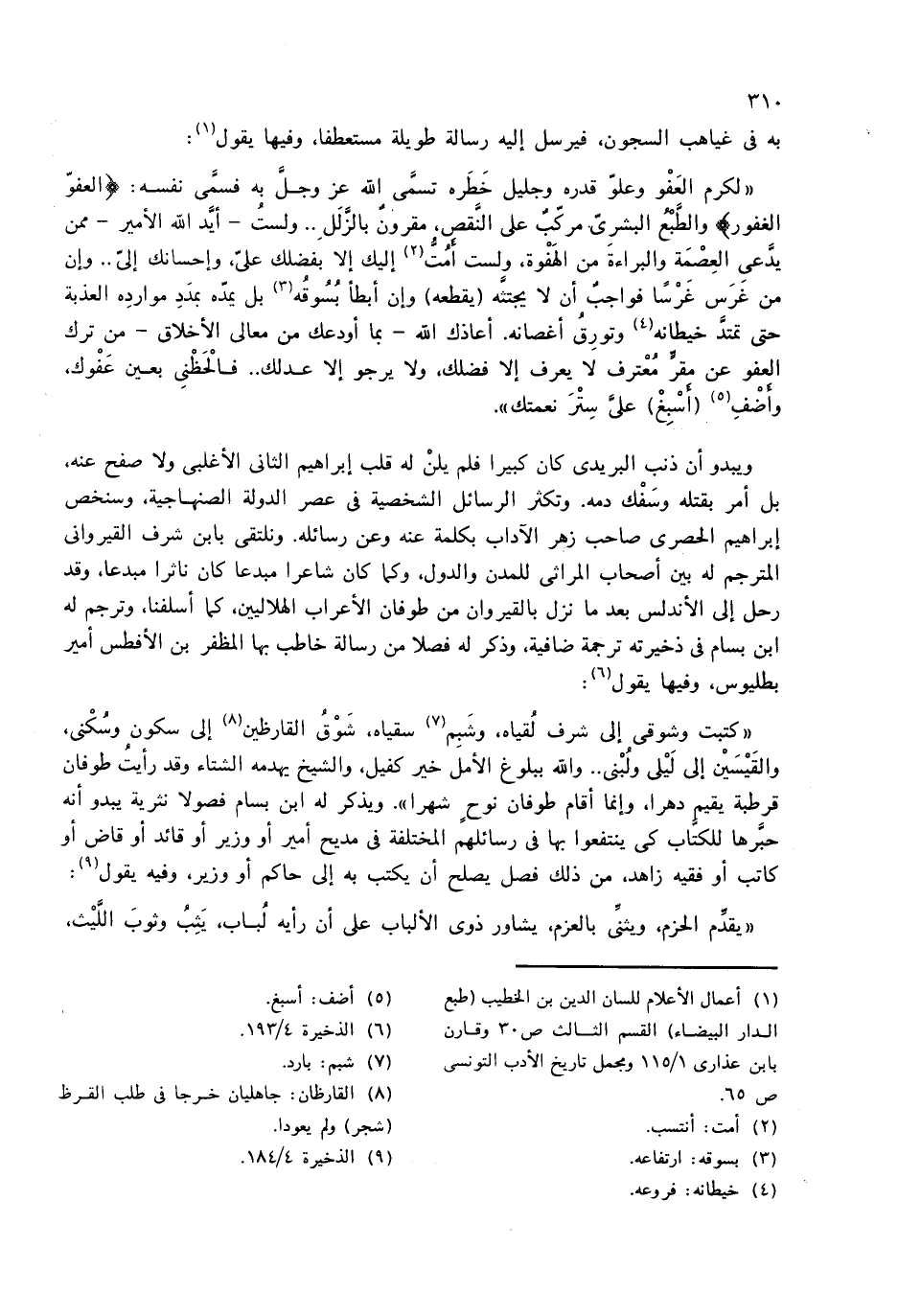 «لكرم العفو وعلوّ قدره وجليل خطره تسمّى الله عزّ وجلّ به فسمّى نفسه: (الْعَفوّ) {الْغَفُورُ} والطّبع البشرىّ مركّب على النّقص، مقرون بالزّلل. . ولست-أيّد الله الأمير-ممن يدّعى العصمة والبراءة من الهفوة، ولست أمتّ (¬2) إليك إلا بفضلك علىّ، وإحسانك إلىّ. . وإن من غرس غرسا فواجب أن لا يجتثّه (يقطعه) وإن أبطأ بسوقه (¬3) بل يمدّه بمدد موارده العذبة حتى تمتدّ خيطانه (¬4) وتورق أغصانه. أعاذك الله-بما أودعك من معالى الأخلاق-من ترك العفو عن مقرّ معترف لا يعرف إلا فضلك، ولا يرجو إلا عدلك. . فالحظنى بعين عفوك، وأضف (¬5) (أسبغ) علىّ ستر نعمتك».
