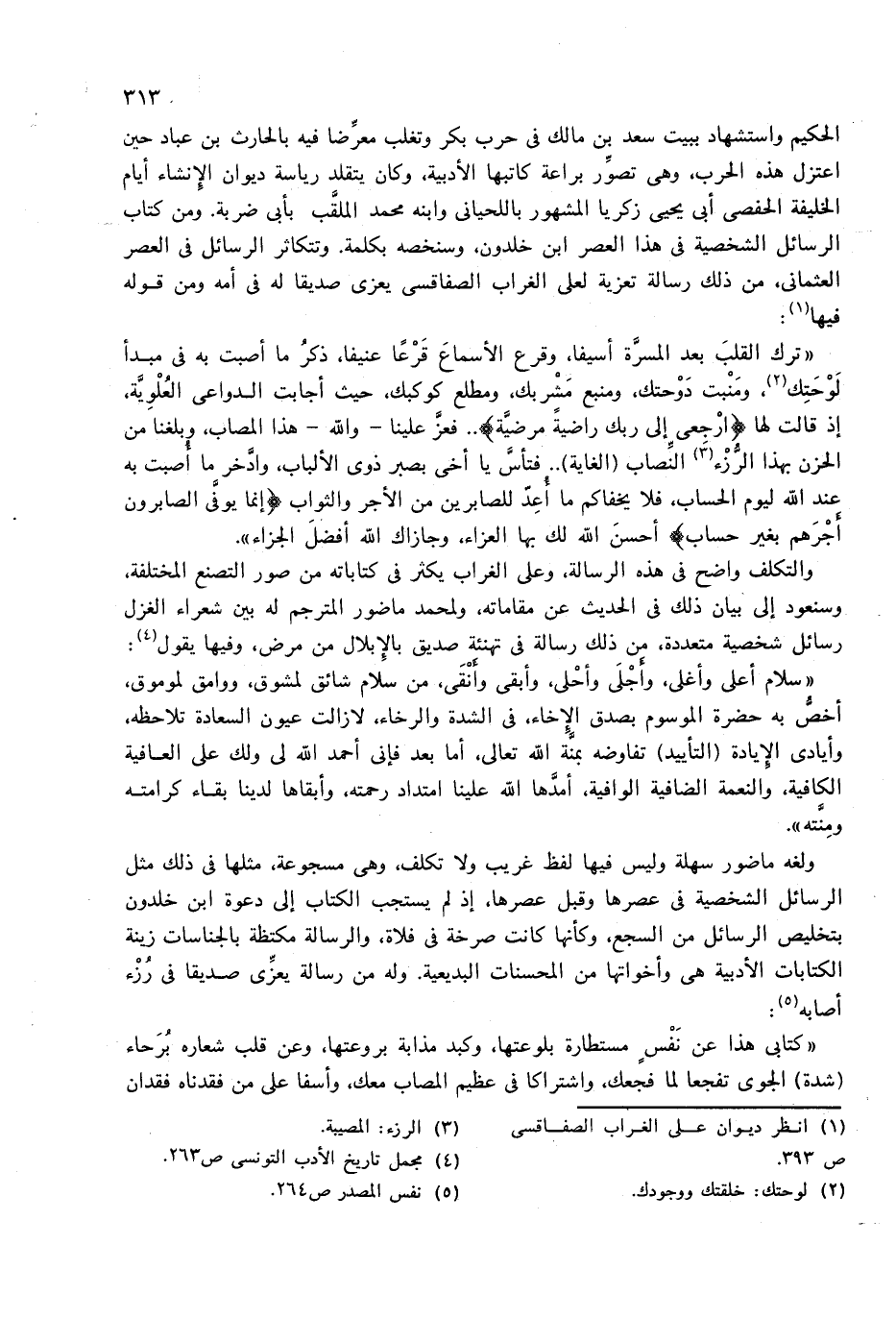 الحكيم واستشهاد ببيت سعد بن مالك فى حرب بكر وتغلب معرّضا فيه بالحارث بن عباد حين اعتزل هذه الحرب، وهى تصوّر براعة كاتبها الأدبية، وكان يتقلد رياسة ديوان الإنشاء أيام الخليفة الحفصى أبى يحيى زكريا المشهور باللحيانى وابنه محمد الملقّب بأبى ضربة. ومن كتاب الرسائل الشخصية فى هذا العصر ابن خلدون، وسنخصه بكلمة. وتتكاثر الرسائل فى العصر العثمانى، من ذلك رسالة تعزية لعلى الغراب الصفاقسى يعزى صديقا له فى أمه ومن قوله فيها (¬1):