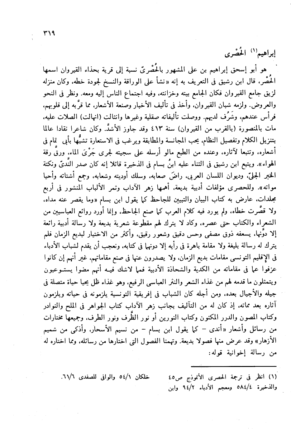 (¬1) انظر فى ترجمة الحصرى الأنموذج ص 45 والذخيرة 4/ 584 ومعجم الأدباء 2/ 94 وابن خلكان 1/ 54 والوافى للصفدى 6/ 61.