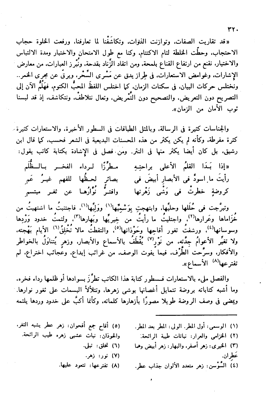 والفصل ملئ بالاستعارات فسطور كتابة هذا الكاتب تطرّز بسوادها أو ظلمها رداء فخره، وما أشبه كتاباته بروضة تتمايل أغصانها بوشى زهرها، وتتلألأ البسمات على ثغور نوارها.