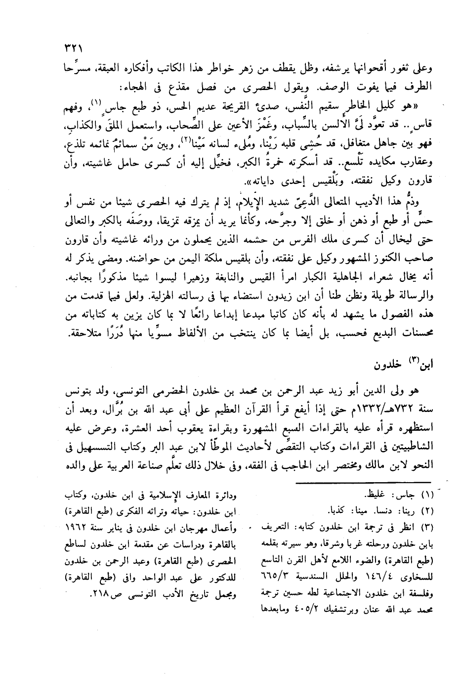 (¬3) انظر فى ترجمة ابن خلدون كتابه: التعريف بابن خلدون ورحلته غربا وشرقا، وهو سيرته بقلمه (طبع القاهرة) والضوء اللامع لأهل القرن التاسع للسخاوى 4/ 146 والحلل السندسية 3/ 665 وفلسفة ابن خلدون الاجتماعية لطه حسين ترجمة محمد عبد الله عنان وبرتشفيك 2/ 405 وما بعدها ودائرة المعارف الإسلامية فى ابن خلدون، وكتاب ابن خلدون: حياته وتراثه الفكرى (طبع القاهرة) وأعمال مهرجان ابن خلدون فى يناير سنة 1962 بالقاهرة ودراسات عن مقدمة ابن خلدون لساطع الحصرى (طبع القاهرة) وعبد الرحمن بن خلدون للدكتور على عبد الواحد وافى (طبع القاهرة) ومجمل تاريخ الأدب التونسى ص 218.
