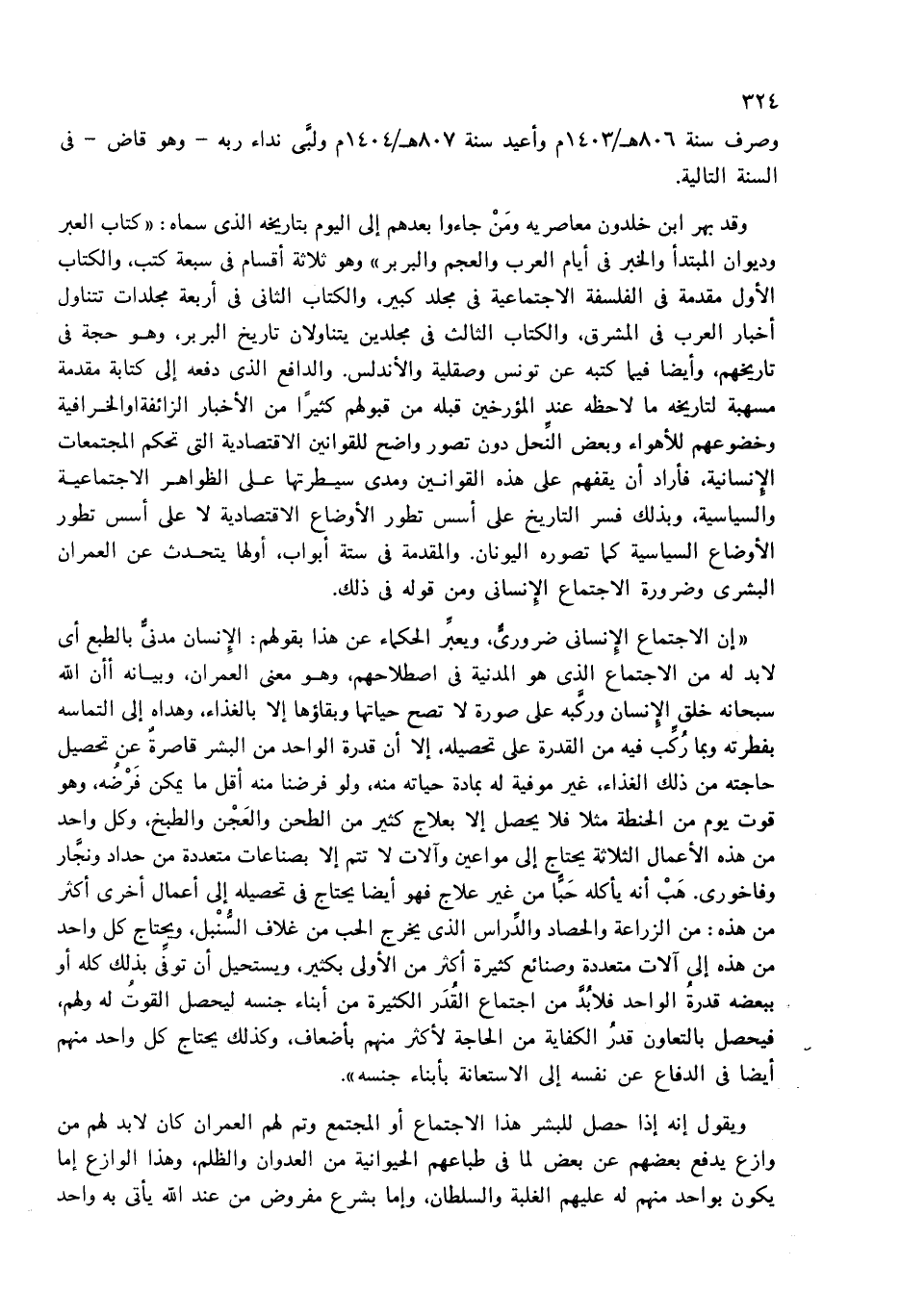 «إن الاجتماع الإنسانى ضرورىّ، ويعبّر الحكماء عن هذا بقولهم: الإنسان مدنىّ بالطبع أى لا بد له من الاجتماع الذى هو المدنية فى اصطلاحهم، وهو معنى العمران، وبيانه أأن الله سبحانه خلق الإنسان وركّبه على صورة لا تصح حياتها وبقاؤها إلا بالغذاء، وهداه إلى التماسه بفطرته وبما ركّب فيه من القدرة على تحصيله، إلا أن قدرة الواحد من البشر قاصرة عن تحصيل حاجته من ذلك الغذاء، غير موفية له بمادة حياته منه، ولو فرضنا منه أقل ما يمكن فرضه، وهو قوت يوم من الحنطة مثلا فلا يحصل إلا بعلاج كثير من الطحن والعجن والطبخ، وكل واحد من هذه الأعمال الثلاثة يحتاج إلى مواعين وآلات لا تتم إلا بصناعات متعددة من حداد ونجّار وفاخورى. هب أنه يأكله حبّا من غير علاج فهو أيضا يحتاج فى تحصيله إلى أعمال أخرى أكثر من هذه: من الزراعة والحصاد والدّراس الذى يخرج الحب من غلاف السّنبل، ويحتاج كل واحد من هذه إلى آلات متعددة وصنائع كثيرة أكثر من الأولى بكثير، ويستحيل أن توفّى بذلك كله أو ببعضه قدرة الواحد فلا بدّ من اجتماع القدر الكثيرة من أبناء جنسه ليحصل القوت له ولهم، فيحصل بالتعاون قدر الكفاية من الحاجة لأكثر منهم بأضعاف، وكذلك يحتاج كل واحد منهم أيضا فى الدفاع عن نفسه إلى الاستعانة بأبناء جنسه».