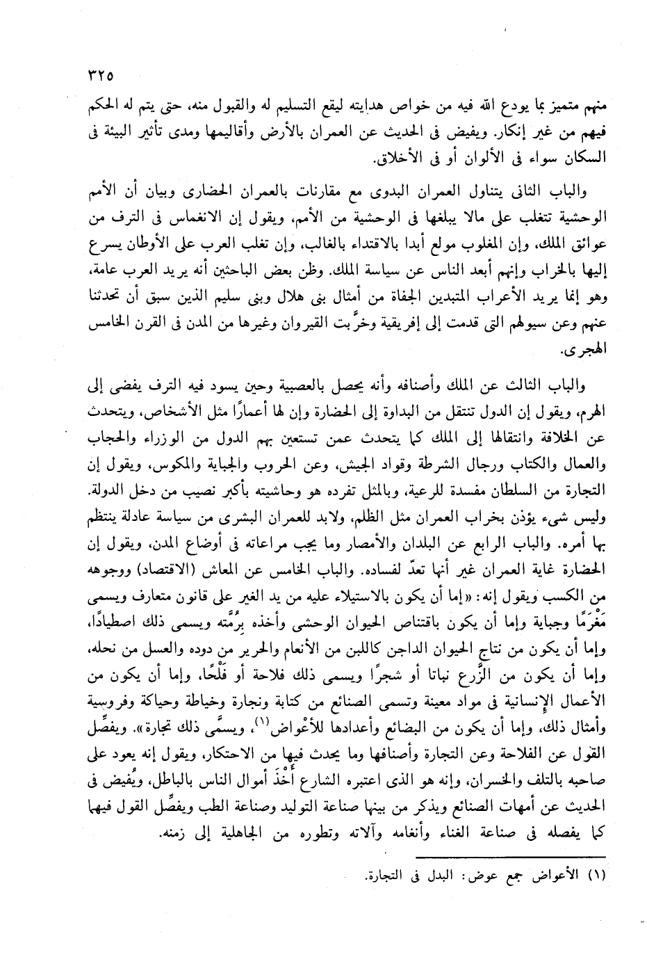 وليس شئ يؤذن بخراب العمران مثل الظلم، ولا بد للعمران البشرى من سياسة عادلة ينتظم بها أمره. والباب الرابع عن البلدان والأمصار وما يجب مراعاته فى أوضاع المدن، ويقول إن الحضارة غاية العمران غير أنها تعدّ لفساده. والباب الخامس عن المعاش (الاقتصاد) ووجوهه من الكسب ويقول إنه: «إما أن يكون بالاستيلاء عليه من يد الغير على قانون متعارف ويسمى مغرما وجباية وإما أن يكون باقتناص الحيوان الوحشى وأخذه برمّته ويسمى ذلك اصطيادا، وإما أن يكون من نتاج الحيوان الداجن كاللبن من الأنعام والحرير من دوده والعسل من نحله، وإما أن يكون من الزّرع نباتا أو شجرا ويسمى ذلك فلاحة أو فلحا، وإما أن يكون من الأعمال الإنسانية فى مواد معينة وتسمى الصنائع من كتابة ونجارة وخياطة وحياكة وفروسية وأمثال ذلك، وإما أن يكون من البضائع وأعدادها للأعواض (¬1)، ويسمّى ذلك تجارة». ويفصّل القول عن الفلاحة وعن التجارة وأصنافها وما يحدث فيها من الاحتكار، ويقول إنه يعود على صاحبه بالتلف والخسران، وإنه هو الذى اعتبره الشارع أخذ أموال الناس بالباطل، ويفيض فى الحديث عن أمهات الصنائع ويذكر من بينها صناعة التوليد وصناعة الطب ويفصّل القول فيهما كما يفصله فى صناعة الغناء وأنغامه وآلاته وتطوره من الجاهلية إلى زمنه.