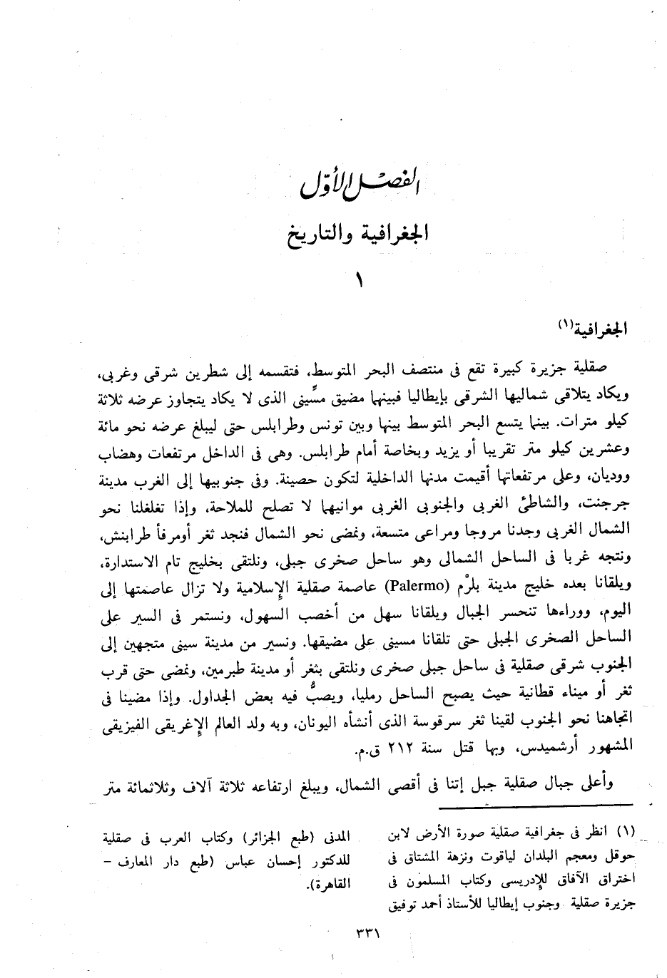 (¬1) انظر فى جغرافية صقلية صورة الأرض لابن حوقل ومعجم البلدان لياقوت ونزهة المشتاق فى اختراق الآفاق للإدريسى وكتاب المسلمون فى جزيرة صقلية وجنوب إيطاليا للأستاذ أحمد توفيق المدنى (طبع الجزائر) وكتاب العرب فى صقلية للدكتور إحسان عباس (طبع دار المعارف- القاهرة).