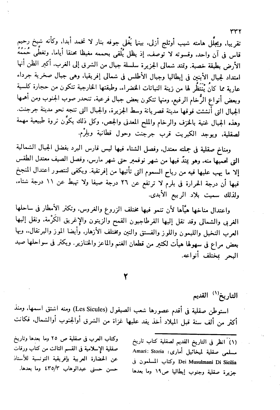 (¬1) انظر فى التاريخ القديم لصقلية كتاب تاريخ مسلمى صقلية لميخائيل أمارى Dei Musulmani Di Sicilia Amari: Storia: وكتاب المسلمون فى جزيرة صقلية وجنوب إيطاليا ص 19 وما بعدها وكتاب العرب فى صقلية ص 25 وما بعدها وتاريخ صقلية الإسلامية فى القسم الثالث من كتاب ورقات عن الحضارة العربية بإفريقية التونسية للأستاذ حسن حسنى عبد الوهاب 3/ 435 وما بعدها.