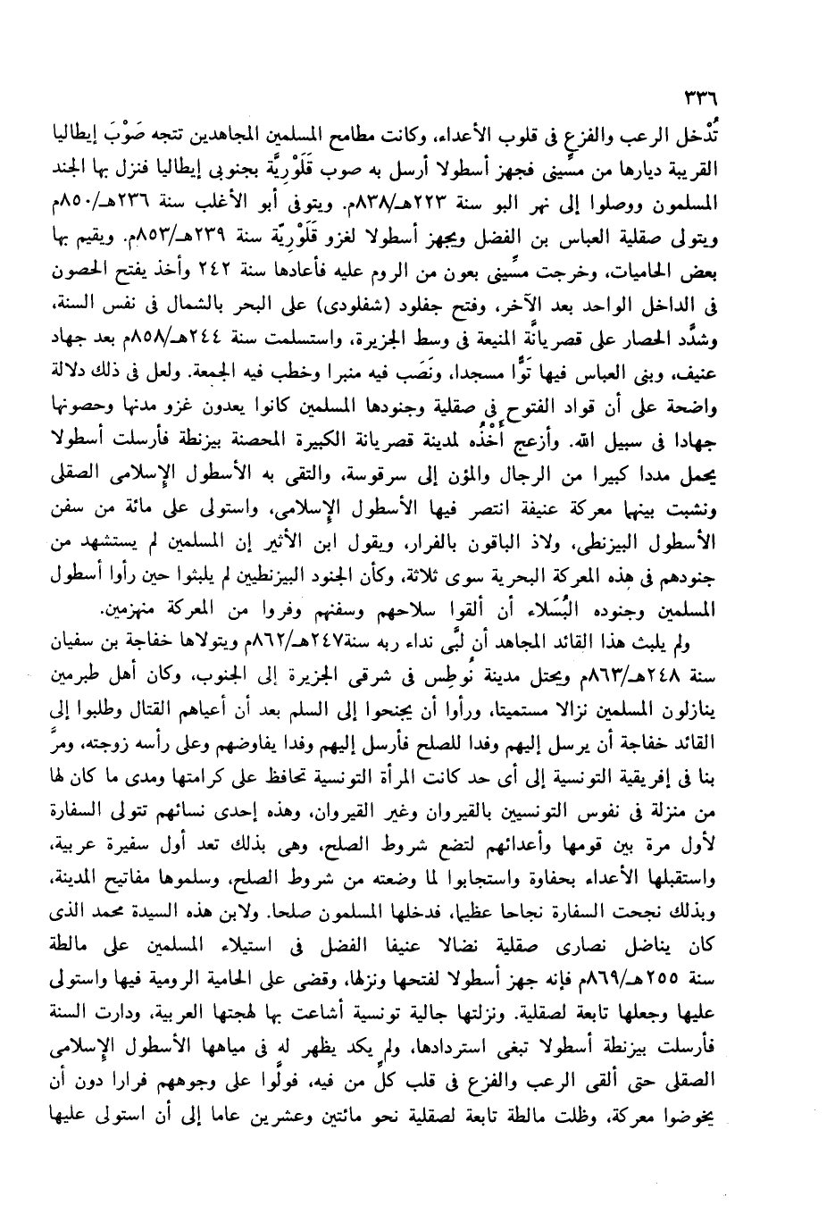ولم يلبث هذا القائد المجاهد أن لبّى نداء ربه سنة 247 هـ/862 م ويتولاها خفاجة بن سفيان سنة 248 هـ/863 م ويحتل مدينة نوطس فى شرقى الجزيرة إلى الجنوب، وكان أهل طبرمين ينازلون المسلمين نزالا مستميتا، ورأوا أن يجنحوا إلى السلم بعد أن أعياهم القتال وطلبوا إلى القائد خفاجة أن يرسل إليهم وفدا للصلح فأرسل إليهم وفدا يفاوضهم وعلى رأسه زوجته، ومرّ بنا فى إفريقية التونسية إلى أى حد كانت المرأة التونسية تحافظ على كرامتها ومدى ما كان لها من منزلة فى نفوس التونسيين بالقيروان وغير القيروان، وهذه إحدى نسائهم تتولى السفارة لأول مرة بين قومها وأعدائهم لتضع شروط الصلح، وهى بذلك تعد أول سفيرة عربية، واستقبلها الأعداء بحفاوة واستجابوا لما وضعته من شروط الصلح، وسلموها مفاتيح المدينة، وبذلك نجحت السفارة نجاحا عظيما، فدخلها المسلمون صلحا. ولابن هذه السيدة محمد الذى كان يناضل نصارى صقلية نضالا عنيفا الفضل فى استيلاء المسلمين على مالطة سنة 255 هـ/869 م فإنه جهز أسطولا لفتحها ونزلها، وقضى على الحامية الرومية فيها واستولى عليها وجعلها تابعة لصقلية. ونزلتها جالية تونسية أشاعت بها لهجتها العربية، ودارت السنة فأرسلت بيزنطة أسطولا تبغى استردادها، ولم يكد يظهر له فى مياهها الأسطول الإسلامى الصقلى حتى ألقى الرعب والفزع فى قلب كلّ من فيه، فولّوا على وجوههم فرارا دون أن يخوضوا معركة، وظلت مالطة تابعة لصقلية نحو مائتين وعشرين عاما إلى أن استولى عليها