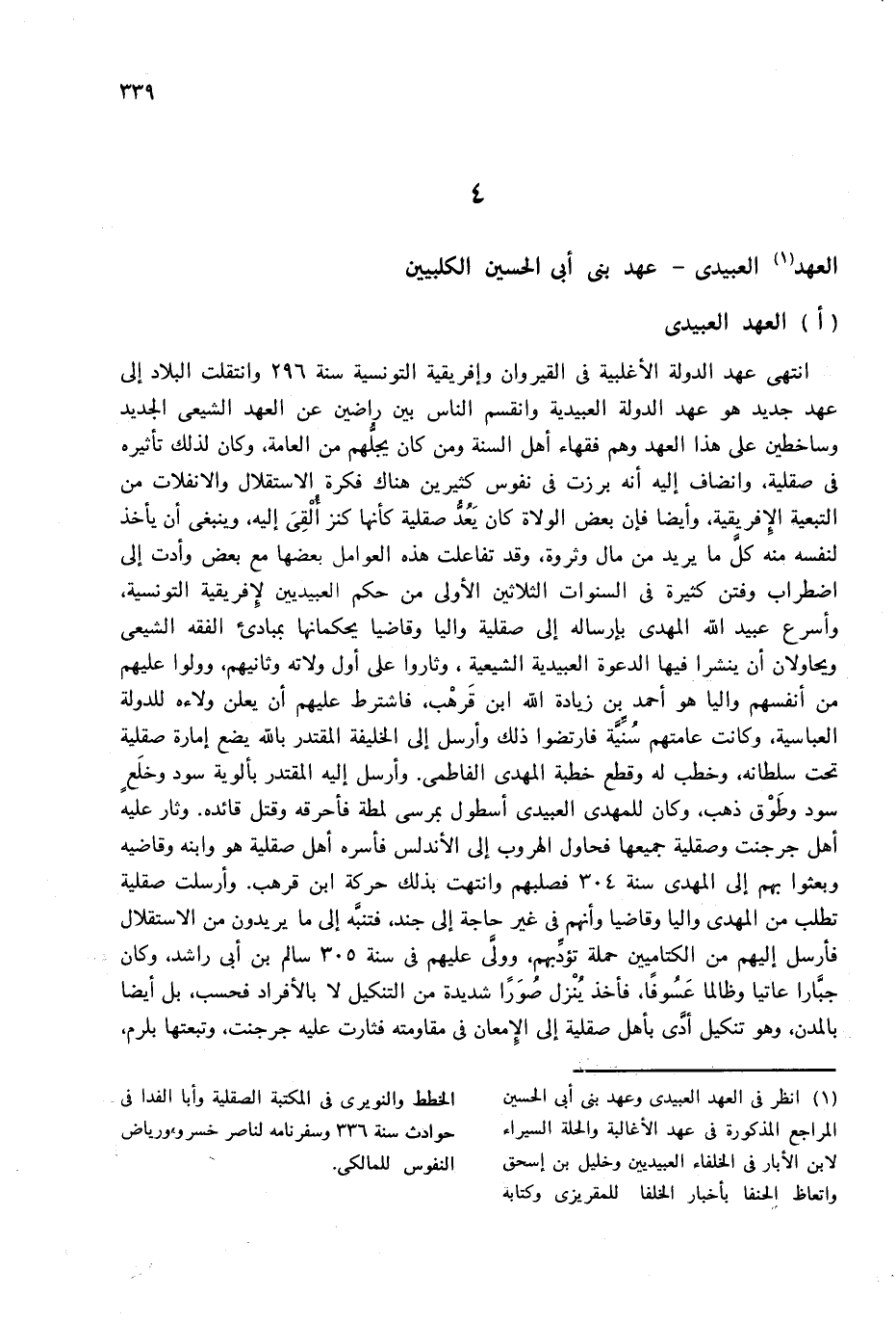 (¬1) انظر فى العهد العبيدى وعهد بنى أبى الحسين المراجع المذكورة فى عهد الأغالبة والحلة السيراء لابن الأبار فى الخلفاء العبيديين وخليل بن إسحاق واتعاظ الحنفا بأخبار الخلفا للمقريزى وكتابه الخطط والنويرى فى المكتبة الصقلية وأبا الفدا فى حوادث سنة 336 وسفرنامه لناصر خسرو، ورياض النفوس للمالكى.
