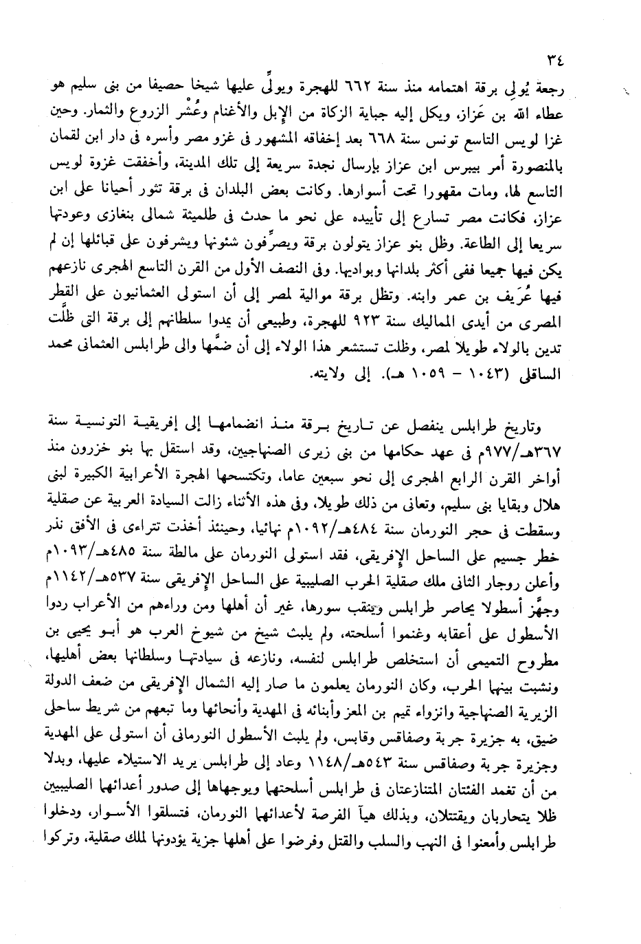 وتاريخ طرابلس ينفصل عن تاريخ برقة منذ انضمامها إلى إفريقية التونسية سنة 367 هـ/977 م فى عهد حكامها من بنى زيرى الصنهاجيين، وقد استقل بها بنو خزرون منذ أواخر القرن الرابع الهجرى إلى نحو سبعين عاما، وتكتسحها الهجرة الأعرابية الكبيرة لبنى هلال وبقايا بنى سليم، وتعانى من ذلك طويلا، وفى هذه الأثناء زالت السيادة العربية عن صقلية وسقطت فى حجر النورمان سنة 484 هـ/1092 م نهائيا، وحينئذ أخذت تتراءى فى الأفق نذر خطر جسيم على الساحل الإفريقى، فقد استولى النورمان على مالطة سنة 485 هـ/1093 م وأعلن روجار الثانى ملك صقلية الحرب الصليبية على الساحل الإفريقى سنة 537 هـ/1142 م وجهّز أسطولا يحاصر طرابلس وينقب سورها، غير أن أهلها ومن وراءهم من الأعراب ردوا الأسطول على أعقابه وغنموا أسلحته، ولم يلبث شيخ من شيوخ العرب هو أبو يحيى بن مطروح التميمى أن استخلص طرابلس لنفسه، ونازعه فى سيادتها وسلطانها بعض أهليها، ونشبت بينهما الحرب، وكان النورمان يعلمون ما صار إليه الشمال الإفريقى من ضعف الدولة الزيرية الصنهاجية وانزواء تميم بن المعز وأبنائه فى المهدية وأنحائها وما تبعهم من شريط ساحلى ضيق، به جزيرة جربة وصفاقس وقابس، ولم يلبث الأسطول النورمانى أن استولى على المهدية وجزيرة جربة وصفاقس سنة 543 هـ/1148 وعاد إلى طرابلس يريد الاستيلاء عليها، وبدلا من أن تغمد الفئتان المتنازعتان فى طرابلس أسلحتهما ويوجهاها إلى صدور أعدائهما الصليبيين ظلا يتحاربان ويقتتلان، وبذلك هيئ الفرصة لأعدائهما النورمان، فتسلقوا الأسوار، ودخلوا طرابلس وأمعنوا فى النهب والسلب والقتل وفرضوا على أهلها جزية يؤدونها لملك صقلية، وتركوا