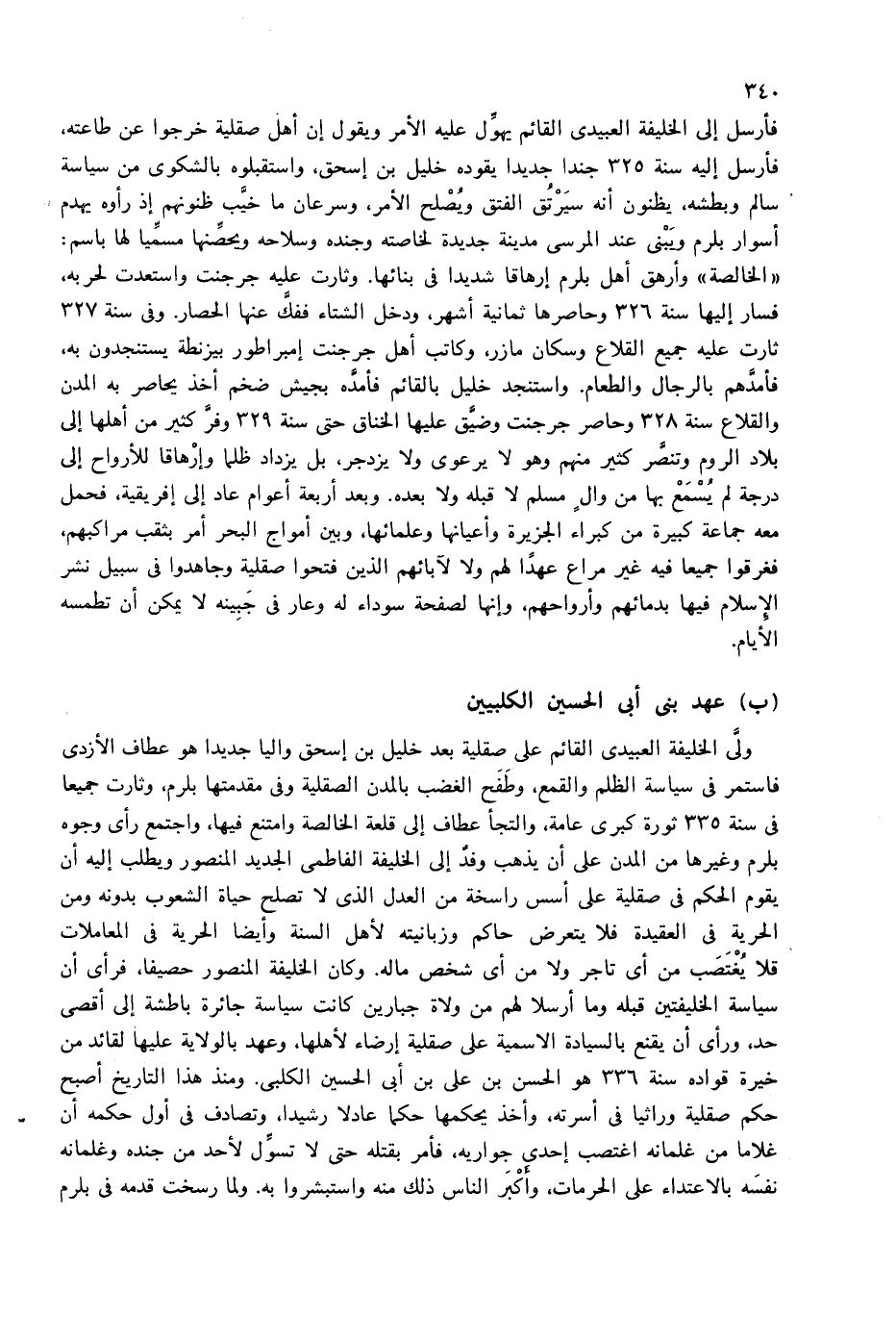 «الخالصة» وأرهق أهل بلرم إرهاقا شديدا فى بنائها. وثارت عليه جرجنت واستعدت لحربه، فسار إليها سنة 326 وحاصرها ثمانية أشهر، ودخل الشتاء ففكّ عنها الحصار. وفى سنة 327 ثارت عليه جميع القلاع وسكان مازر، وكاتب أهل جرجنت إمبراطور بيزنطة يستنجدون به، فأمدّهم بالرجال والطعام. واستنجد خليل بالقائم فأمدّه بجيش ضخم أخذ يحاصر به المدن والقلاع سنة 328 وحاصر جرجنت وضيّق عليها الخناق حتى سنة 329 وفرّ كثير من أهلها إلى بلاد الروم وتنصّر كثير منهم وهو لا يرعوى ولا يزدجر، بل يزداد ظلما وإرهاقا للأرواح إلى درجة لم يسمع بها من وال مسلم لا قبله ولا بعده. وبعد أربعة أعوام عاد إلى إفريقية، فحمل معه جماعة كبيرة من كبراء الجزيرة وأعيانها وعلمائها، وبين أمواج البحر أمر بثقب مراكبهم، فغرقوا جميعا فيه غير مراع عهدا لهم ولا لآبائهم الذين فتحوا صقلية وجاهدوا فى سبيل نشر الإسلام فيها بدمائهم وأرواحهم، وإنها لصفحة سوداء له وعار فى جبينه لا يمكن أن تطمسه الأيام.