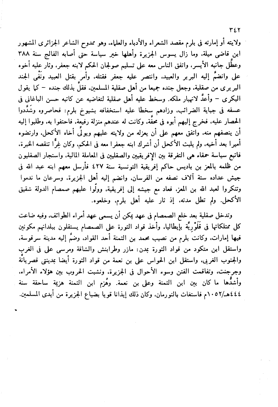 ولايته أو إمارته فى بلرم مقصد الشعراء والأدباء والعلماء، وهو ممدوح الشاعر الجزائرى المشهور ابن قاضى ميلة، وما زال يسوس الجزيرة وأهلها خير سياسة حتى أصابه الفالج سنة 388 وعطّل جانبه الأيسر، واتفق الناس معه على تسليم صولجان الحكم لابنه جعفر، وثار عليه أخوه على وانضمّ إليه البربر والعبيد، وانتصر عليه جعفر فقتله، وأمر بقتل العبيد ونفى الجند البربرى من صقلية، وجعل جنده جميعا من أهل صقلية المسلمين، فقلّ بذلك جنده-كما يقول البكرى-وأعدّ لانهيار ملكه. وسخط عليه أهل صقلية لتغاضيه عن كاتبه حسن الباغانى فى عسفه فى جباية الضرائب، وزادهم سخطا عليه استخفافه بشيوخ بلرم: فحاصروه وشدّدوا الحصار عليه، فخرج إليهم أبوه فى محفّة، وكانت له عندهم منزلة رفيعة، فاحتفوا به، وطلبوا إليه أن ينصفهم منه، واتفق معهم على أن يعزله من ولايته عليهم ويولّى أخاه الأكحل، وارتضوه أميرا بعد أخيه، ولم يلبث الأكحل أن أشرك ابنه جعفرا معه فى الحكم، وكان غرّا تنقصه الخبرة، فاتبع سياسة حمقاء هى التفرقة بين الإفريقيين والصقليين فى المعاملة المالية، واستجار الصقليون من ظلمه بالمعز بن باديس حاكم إفريقية التونسية سنة 427 فأرسل معهم ابنه عبد الله فى جيش عداده ستة آلاف نصفه من الفرسان، وانضم إليه أهل الجزيرة، وسرعان ما ندموا وتنكروا لعبد الله بن المعز، فعاد مع جيشه إلى إفريقية، وولّوا عليهم صمصام الدولة شقيق الأكحل. ولم تطل مدته، إذ ثار عليه أهل بلرم، وخلعوه.
