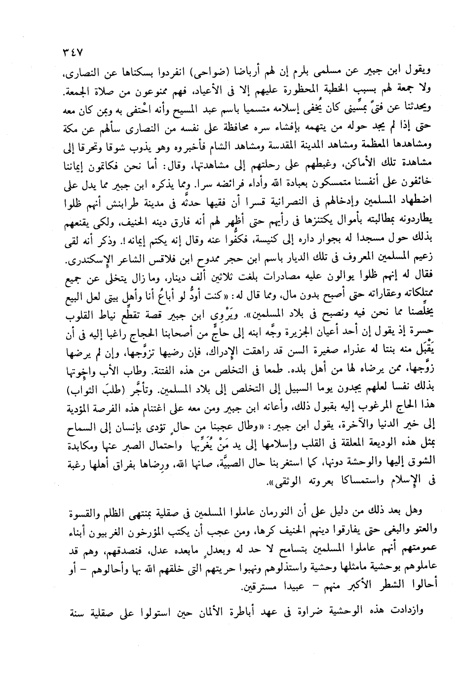 ويقول ابن جبير عن مسلمى بلرم إن لهم أرباضا (ضواحى) انفردوا بسكناها عن النصارى، ولا جمعة لهم بسبب الخطبة المحظورة عليهم إلا فى الأعياد، فهم ممنوعون من صلاة الجمعة.
