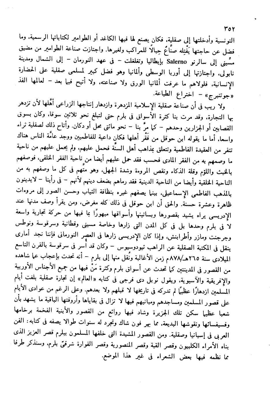 التونسية وأدخلتها إلى صقلية، فكان يصنع لها فيها الكاغد أو الطوامير لكتاباتها الرسمية، وما فضل عن حاجتها يفتله صنّاع حبالا للمراكب ولغيرها. واجتازت صناعة الطوامير من مضيق مسّينى إلى سالرنو Salerno بإيطاليا وتغلغلت-فى عهد النورمان-إلى الشمال ومدينة نابولى، واجتازتها إلى أوربا الوسطى وألمانيا وهو فضل كبير لمسلمى صقلية على الحضارة الإنسانية، فلولاهم ما عرفت ألمانيا الورق ولا صناعته، ولا أتيح فيما بعد-لعالمها الفذ «جوتنبرج» -اختراع الطباعة.