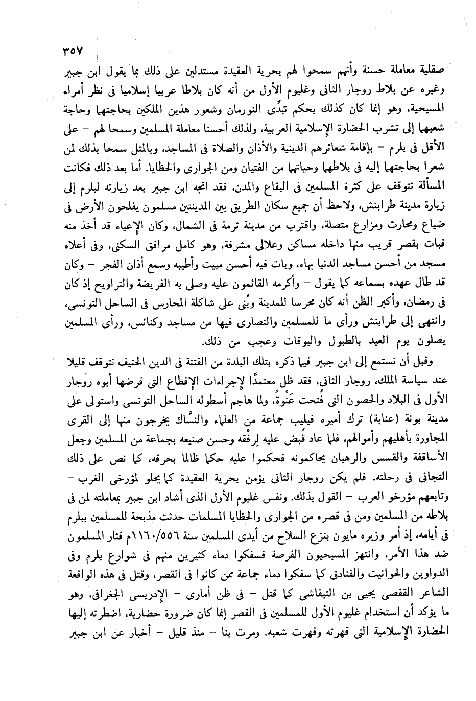 صقلية معاملة حسنة وأنهم سمحوا لهم بحرية العقيدة مستدلين على ذلك بما يقول ابن جبير وغيره عن بلاط روجار الثانى وغليوم الأول من أنه كان بلاطا عربيا إسلاميا فى نظر أمراء المسيحية، وهو إنما كان كذلك بحكم تبدّى النورمان وشعور هذين الملكين بحاجتهما وحاجة شعبهما إلى تشرب الحضارة الإسلامية العربية، ولذلك أحسنا معاملة المسلمين وسمحا لهم-على الأقل فى بلرم-بإقامة شعائرهم الدينية والأذان والصلاة فى المساجد، وبالمثل سمحا بذلك لمن شعرا بحاجتهما إليه فى بلاطهما وحياتهما من الفتيان ومن الجوارى والحظايا. أما بعد ذلك فكانت المسألة تتوقف على كثرة المسلمين فى البقاع والمدن، فقد اتجه ابن جبير بعد زيارته لبلرم إلى زيارة مدينة طرابنش، ولا حظ أن جميع سكان الطريق بين المدينتين مسلمون يفلحون الأرض فى ضياع ومحارث ومزارع متصلة، واقترب من مدينة ثرمة فى الشمال، وكان الإعياء قد أخذ منه فبات بقصر قريب منها داخله مساكن وعلالى مشرفة، وهو كامل مرافق السكنى، وفى أعلاه مسجد من أحسن مساجد الدنيا بهاء، وبات فيه أحسن مبيت وأطيبه وسمع أذان الفجر-وكان قد طال عهده بسماعه كما يقول-وأكرمه القائمون عليه وصلّى به الفريضة والتراويح إذ كان فى رمضان، وأكبر الظن أنه كان محرسا للمدينة وبنى على شاكلة المحارس فى الساحل التونسى، وانتهى إلى طرابنش ورأى ما للمسلمين والنصارى فيها من مساجد وكنائس، ورأى المسلمين يصلون يوم العيد بالطبول والبوقات وعجب من ذلك.
