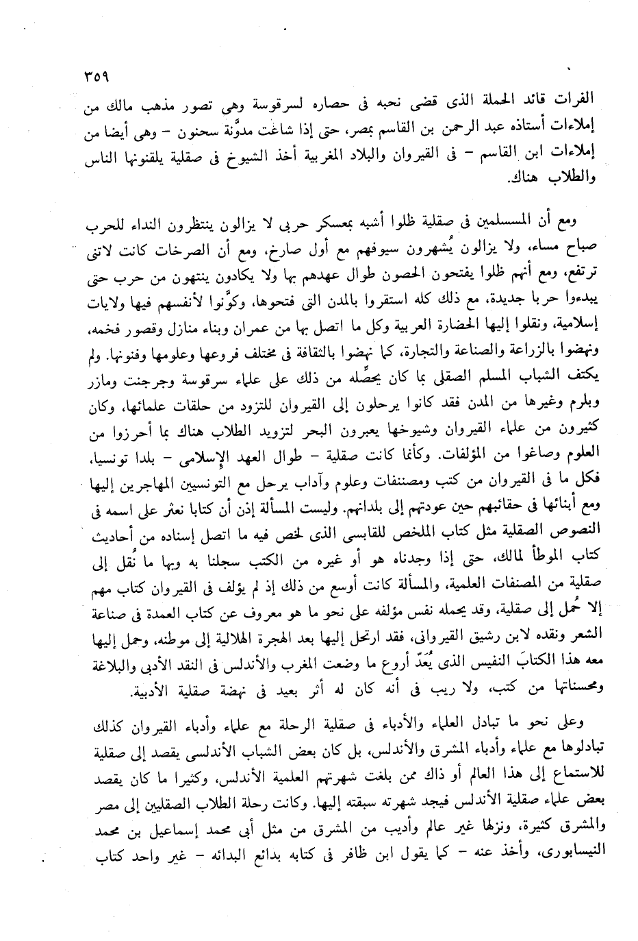 ومع أن المسلمين فى صقلية ظلوا أشبه بمعسكر حربى لا يزالون ينتظرون النداء للحرب صباح مساء، ولا يزالون يشهرون سيوفهم مع أول صارخ، ومع أن الصرخات كانت لا تنى ترتفع، ومع أنهم ظلوا يفتحون الحصون طوال عهدهم بها ولا يكادون ينتهون من حرب حتى يبدءوا حربا جديدة، مع ذلك كله استقروا بالمدن التى فتحوها، وكوّنوا لأنفسهم فيها ولايات إسلامية، ونقلوا إليها الحضارة العربية وكل ما اتصل بها من عمران وبناء منازل وقصور فخمه، ونهضوا بالزراعة والصناعة والتجارة، كما نهضوا بالثقافة فى مختلف فروعها وعلومها وفنونها. ولم يكتف الشباب المسلم الصقلى بما كان يحصّله من ذلك على علماء سرقوسة وجرجنت ومازر وبلرم وغيرها من المدن فقد كانوا يرحلون إلى القيروان للتزود من حلقات علمائها، وكان كثيرون من علماء القيروان وشيوخها يعبرون البحر لتزويد الطلاب هناك بما أحرزوا من العلوم وصاغوا من المؤلفات. وكأنما كانت صقلية-طوال العهد الإسلامى-بلدا تونسيا، فكل ما فى القيروان من كتب ومصنفات وعلوم وآداب يرحل مع التونسيين المهاجرين إليها ومع أبنائها فى حقائبهم حين عودتهم إلى بلدانهم. وليست المسألة إذن أن كتابا نعثر على اسمه فى النصوص الصقلية مثل كتاب الملخص للقابسى الذى لخص فيه ما اتصل إسناده من أحاديث كتاب الموطأ لمالك، حتى إذا وجدناه هو أو غيره من الكتب سجلنا به وبها ما نقل إلى صقلية من المصنفات العلمية، والمسألة كانت أوسع من ذلك إذ لم يؤلف فى القيروان كتاب مهم إلا حمل إلى صقلية، وقد يحمله نفس مؤلفه على نحو ما هو معروف عن كتاب العمدة فى صناعة الشعر ونقده لابن رشيق القيروانى، فقد ارتحل إليها بعد الهجرة الهلالية إلى موطنه، وحمل إليها معه هذا الكتاب النفيس الذى يعدّ أروع ما وضعت المغرب والأندلس فى النقد الأدبى والبلاغة ومحسناتها من كتب، ولا ريب فى أنه كان له أثر بعيد فى نهضة صقلية الأدبية.
