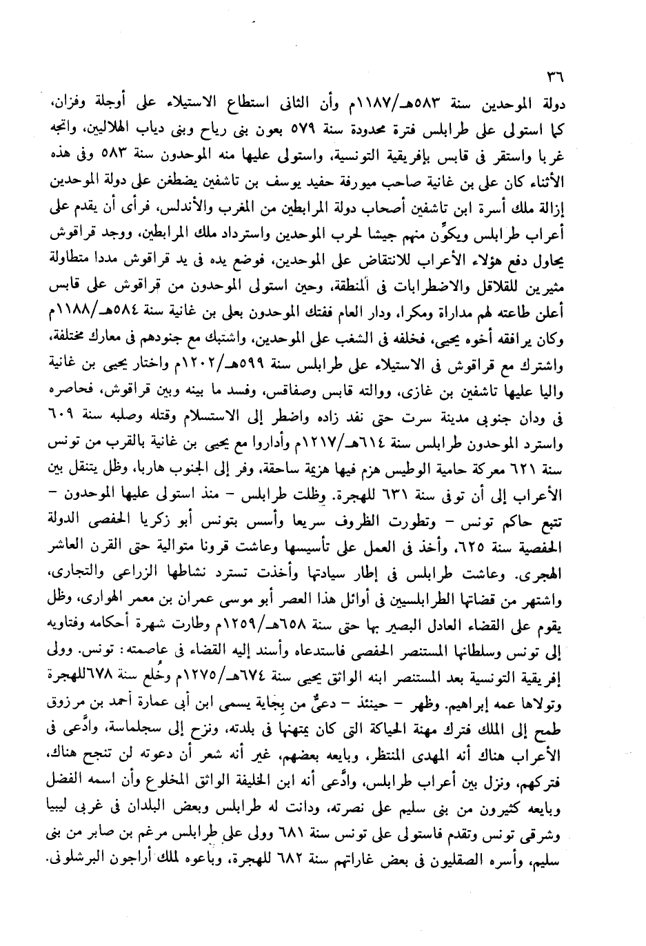 دولة الموحدين سنة 583 هـ/1187 م وأن الثانى استطاع الاستيلاء على أوجلة وفزان، كما استولى على طرابلس فترة محدودة سنة 579 بعون بنى رياح وبنى دياب الهلاليين، واتجه غربا واستقر فى قابس بإفريقية التونسية، واستولى عليها منه الموحدون سنة 583 وفى هذه الأثناء كان على بن غانية صاحب ميورفة حفيد يوسف بن تاشفين يضطغن على دولة الموحدين إزالة ملك أسرة ابن تاشفين أصحاب دولة المرابطين من المغرب والأندلس، فرأى أن يقدم على أعراب طرابلس ويكوّن منهم جيشا لحرب الموحدين واسترداد ملك المرابطين، ووجد قراقوش يحاول دفع هؤلاء الأعراب للانتقاض على الموحدين، فوضع يده فى يد قراقوش مددا متطاولة مثيرين للقلاقل والاضطرابات فى المنطقة، وحين استولى الموحدون من قراقوش على قابس أعلن طاعته لهم مداراة ومكرا، ودار العام ففتك الموحدون بعلى بن غانية سنة 584 هـ/1188 م وكان يرافقه أخوه يحيى، فخلفه فى الشغب على الموحدين، واشتبك مع جنودهم فى معارك مختلفة، واشترك مع قراقوش فى الاستيلاء على طرابلس سنة 599 هـ/1202 م واختار يحيى بن غانية واليا عليها تاشفين بن غازى، ووالته قابس وصفاقس، وفسد ما بينه وبين قراقوش، فحاصره فى ودان جنوبى مدينة سرت حتى نفد زاده واضطر إلى الاستسلام وقتله وصلبه سنة 609 واسترد الموحدون طرابلس سنة 614 هـ/1217 م وأداروا مع يحيى بن غانية بالقرب من تونس سنة 621 معركة حامية الوطيس هزم فيها هزيمة ساحقة، وفر إلى الجنوب هاربا، وظل يتنقل بين الأعراب إلى أن توفى سنة 631 للهجرة. وظلت طرابلس-منذ استولى عليها الموحدون- تتبع حاكم تونس-وتطورت الظروف سريعا وأسس بتونس أبو زكريا الحفصى الدولة الحفصية سنة 625، وأخذ فى العمل على تأسيسها وعاشت قرونا متوالية حتى القرن العاشر الهجرى. وعاشت طرابلس فى إطار سيادتها وأخذت تسترد نشاطها الزراعى والتجارى، واشتهر من قضاتها الطرابلسيين فى أوائل هذا العصر أبو موسى عمران بن معمر الهوارى، وظل يقوم على القضاء العادل البصير بها حتى سنة 658 هـ/1259 م وطارت شهرة أحكامه وفتاويه إلى تونس وسلطانها المستنصر الحفصى فاستدعاه وأسند إليه القضاء فى عاصمته: تونس. وولى إفريقية التونسية بعد المستنصر ابنه الواثق يحيى سنة 674 هـ/1275 م وخلع سنة 678 للهجرة وتولاها عمه إبراهيم. وظهر-حينئذ-دعىّ من بجاية يسمى ابن أبى عمارة أحمد بن مرزوق طمح إلى الملك فترك مهنة الحياكة التى كان يمتهنها فى بلدته، ونزح إلى سجلماسة، وادّعى فى الأعراب هناك أنه المهدى المنتظر، وبايعه بعضهم، غير أنه شعر أن دعوته لن تنجح هناك، فتركهم، ونزل بين أعراب طرابلس، وادّعى أنه ابن الخليفة الواثق المخلوع وأن اسمه الفضل وبايعه كثيرون من بنى سليم على نصرته، ودانت له طرابلس وبعض البلدان فى غربى ليبيا وشرقى تونس وتقدم فاستولى على تونس سنة 681 وولى على طرابلس مرغم بن صابر من بنى سليم، وأسره الصقليون فى بعض غاراتهم سنة 682 للهجرة، وباعوه لملك أراجون البرشلوني.