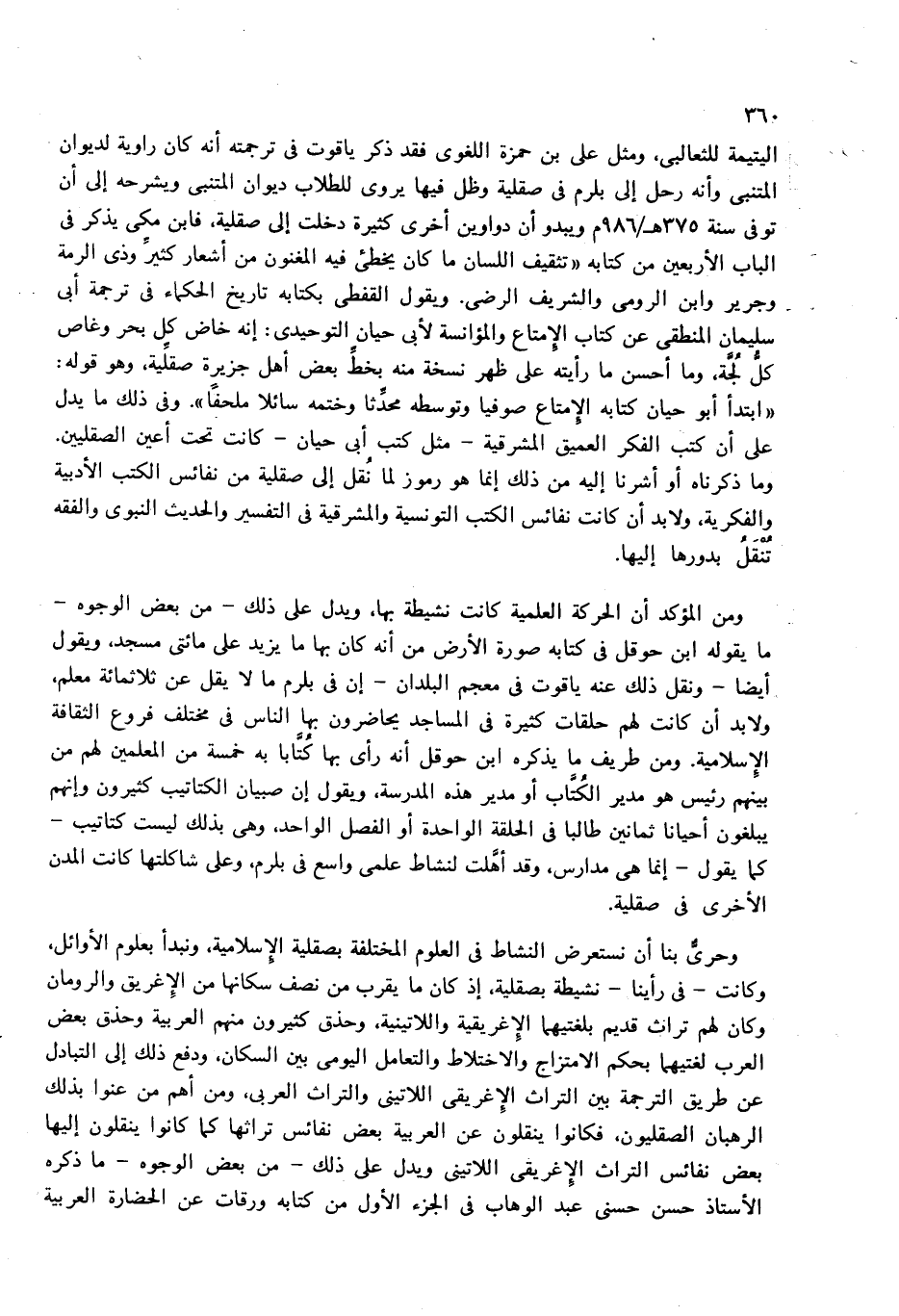 اليتيمة للثعالبى، ومثل على بن حمزة اللغوى فقد ذكر ياقوت فى ترجمته أنه كان راوية لديوان المتنبى وأنه رحل إلى بلرم فى صقلية وظل فيها يروى للطلاب ديوان المتنبى ويشرحه إلى أن توفى سنة 375 هـ/986 م ويبدو أن دواوين أخرى كثيرة دخلت إلى صقلية، فابن مكى يذكر فى الباب الأربعين من كتابه «تثقيف اللسان ما كان يحطى فيه المغنون من أشعار كثير وذى الرمة وجرير وابن الرومى والشريف الرضى. ويقول القفطى بكتابه تاريخ الحكماء فى ترجمة أبى سليمان المنطقى عن كتاب الإمتاع والمؤانسة لأبى حيان التوحيدى: إنه خاض كل بحر وغاص كلّ لجّة، وما أحسن ما رأيته على ظهر نسخة منه بخطّ بعض أهل جزيرة صقلّية، وهو قوله: