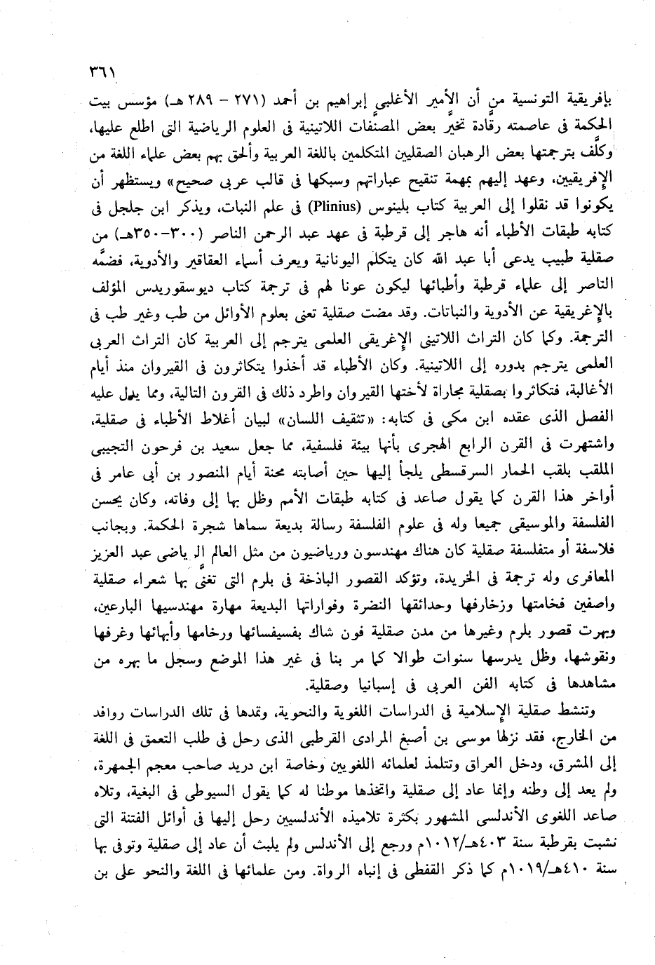 بإفريقية التونسية من أن الأمير الأغلبى إبراهيم بن أحمد (271 - 289 هـ) مؤسس بيت الحكمة فى عاصمته رقّادة تخيّر بعض المصنّفات اللاتينية فى العلوم الرياضية التى اطلع عليها، وكلّف بترجمتها بعض الرهبان الصقليين المتكلمين باللغة العربية وألحق بهم بعض علماء اللغة من الإفريقيين، وعهد إليهم بمهمة تنقيح عباراتهم وسبكها فى قالب عربى صحيح» ويستظهر أن يكونوا قد نقلوا إلى العربية كتاب بلينوس (Plinius) فى علم النبات، ويذكر ابن جلجل فى كتابه طبقات الأطباء أنه هاجر إلى قرطبة فى عهد عبد الرحمن الناصر (300 - 350 هـ) من صقلية طبيب يدعى أبا عبد الله كان يتكلم اليونانية ويعرف أسماء العقاقير والأدوية، فضمّه الناصر إلى علماء قرطبة وأطبائها ليكون عونا لهم فى ترجمة كتاب ديوسقوريدس المؤلف بالإغريقية عن الأدوية والنباتات. وقد مضت صقلية تعنى بعلوم الأوائل من طب وغير طب فى الترجمة. وكما كان التراث اللاتينى الإغريقى العلمى يترجم إلى العربية كان التراث العربى العلمى يترجم بدوره إلى اللاتينية. وكان الأطباء قد أخذوا يتكاثرون فى القيروان منذ أيام الأغالبة، فتكاثروا بصقلية مجاراة لأختها القيروان واطرد ذلك فى القرون التالية، ومما يدل عليه الفصل الذى عقده ابن مكى فى كتابه: «تثقيف اللسان» لبيان أغلاط الأطباء فى صقلية، واشتهرت فى القرن الرابع الهجرى بأنها بيئة فلسفية، مما جعل سعيد بن فرحون التجيبى الملقب بلقب الحمار السرقسطى يلجأ إليها حين أصابته محنة أيام المنصور بن أبى عامر فى أواخر هذا القرن كما يقول صاعد فى كتابه طبقات الأمم وظل بها إلى وفاته، وكان يحسن الفلسفة والموسيقى جميعا وله فى علوم الفلسفة رسالة بديعة سماها شجرة الحكمة. وبجانب فلاسفة أو متفلسفة صقلية كان هناك مهندسون ورياضيون من مثل العالم الرياضى عبد العزيز المعافرى وله ترجمة فى الخريدة، وتؤكد القصور الباذخة فى بلرم التى تغنّى بها شعراء صقلية واصفين فخامتها وزخارفها وحدائقها النضرة وفواراتها البديعة مهارة مهندسيها البارعين، وبهرت قصور بلرم وغيرها من مدن صقلية فون شاك بفسيفسائها ورخامها وأبهائها وغرفها ونقوشها، وظل يدرسها سنوات طوالا كما مر بنا فى غير هذا الموضع وسجل ما بهره من مشاهدها فى كتابه الفن العربى فى إسبانيا وصقلية.