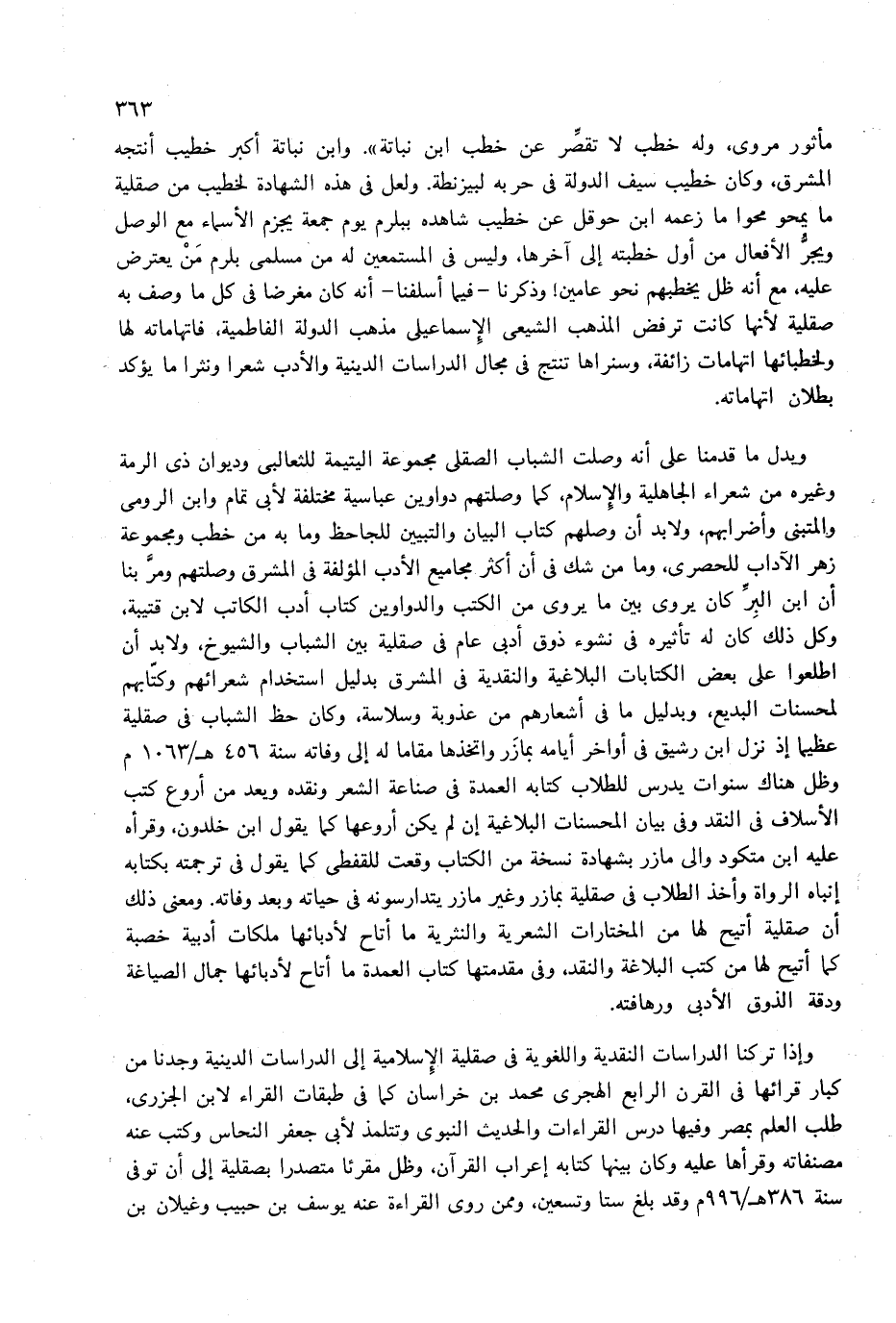 مأثور مروى، وله خطب لا تقصّر عن خطب ابن نباتة». وابن نباتة أكبر خطيب أنتجه المشرق، وكان خطيب سيف الدولة فى حربه لبيزنطة. ولعل فى هذه الشهادة لخطيب من صقلية ما يمحو محوا ما زعمه ابن حوقل عن خطيب شاهده ببلرم يوم جمعة يجزم الأسماء مع الوصل ويجرّ الأفعال من أول خطبته إلى آخرها، وليس فى المستمعين له من مسلمى بلرم من يعترض عليه، مع أنه ظل يخطبهم نحو عامين! وذكرنا-فيما أسلفنا-أنه كان مغرضا فى كل ما وصف به صقلية لأنها كانت ترفض المذهب الشيعى الإسماعيلى مذهب الدولة الفاطمية، فاتهاماته لها ولخطبائها اتهامات زائفة، وسنراها تنتج فى مجال الدراسات الدينية والأدب شعرا ونثرا ما يؤكد بطلان اتهاماته.