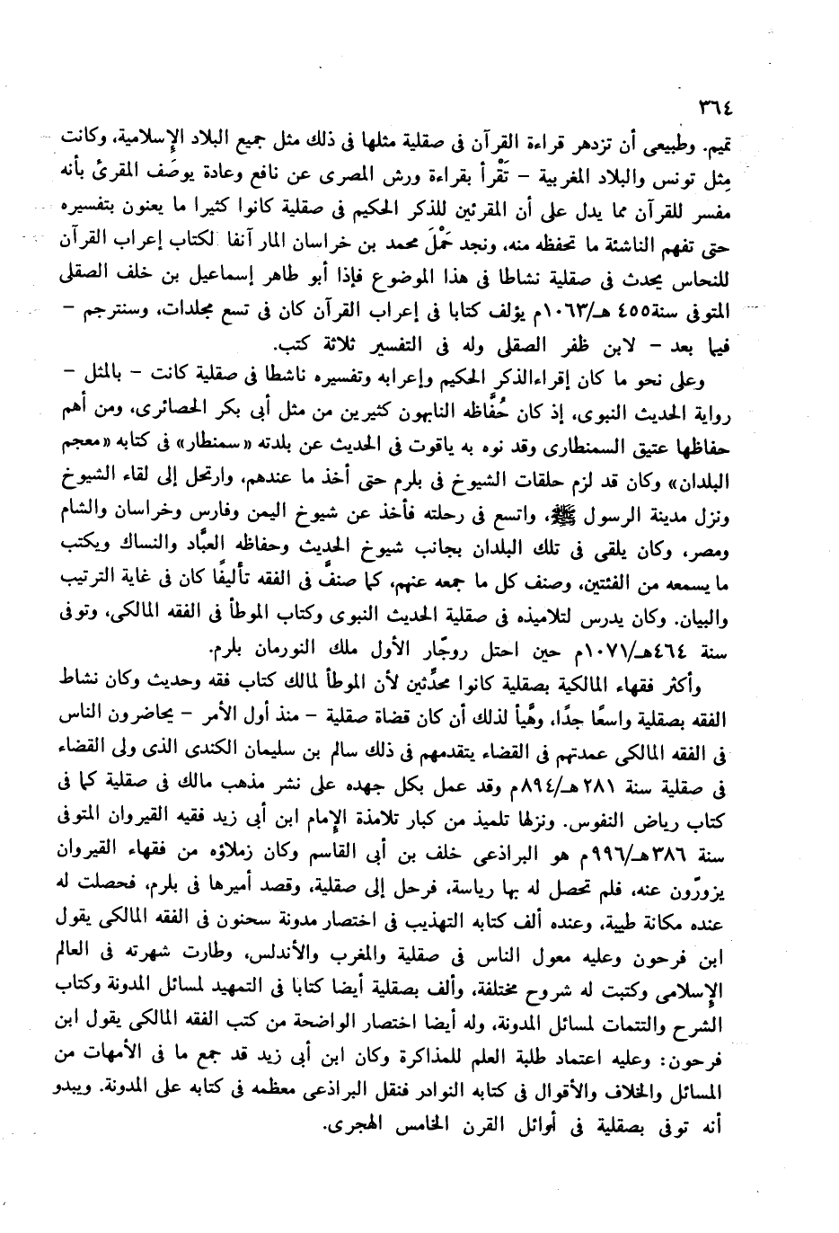 تميم. وطبيعى أن تزدهر قراءة القرآن فى صقلية مثلها فى ذلك مثل جميع البلاد الإسلامية، وكانت مثل تونس والبلاد المغربية-تقرأ بقراءة ورش المصرى عن نافع وعادة يوصف المقرئ بأنه مفسر للقرآن مما يدل على أن المقرئين للذكر الحكيم فى صقلية كانوا كثيرا ما يعنون بتفسيره حتى تفهم الناشئة ما تحفظه منه، ونجد حمل محمد بن خراسان المار آنفا لكتاب إعراب القرآن للنحاس يحدث فى صقلية نشاطا فى هذا الموضوع فإذا أبو طاهر إسماعيل بن خلف الصقلى المتوفى سنة 455 هـ/1063 م يؤلف كتابا فى إعراب القرآن كان فى تسع مجلدات، وسنترجم- فيما بعد-لابن ظفر الصقلى وله فى التفسير ثلاثة كتب.