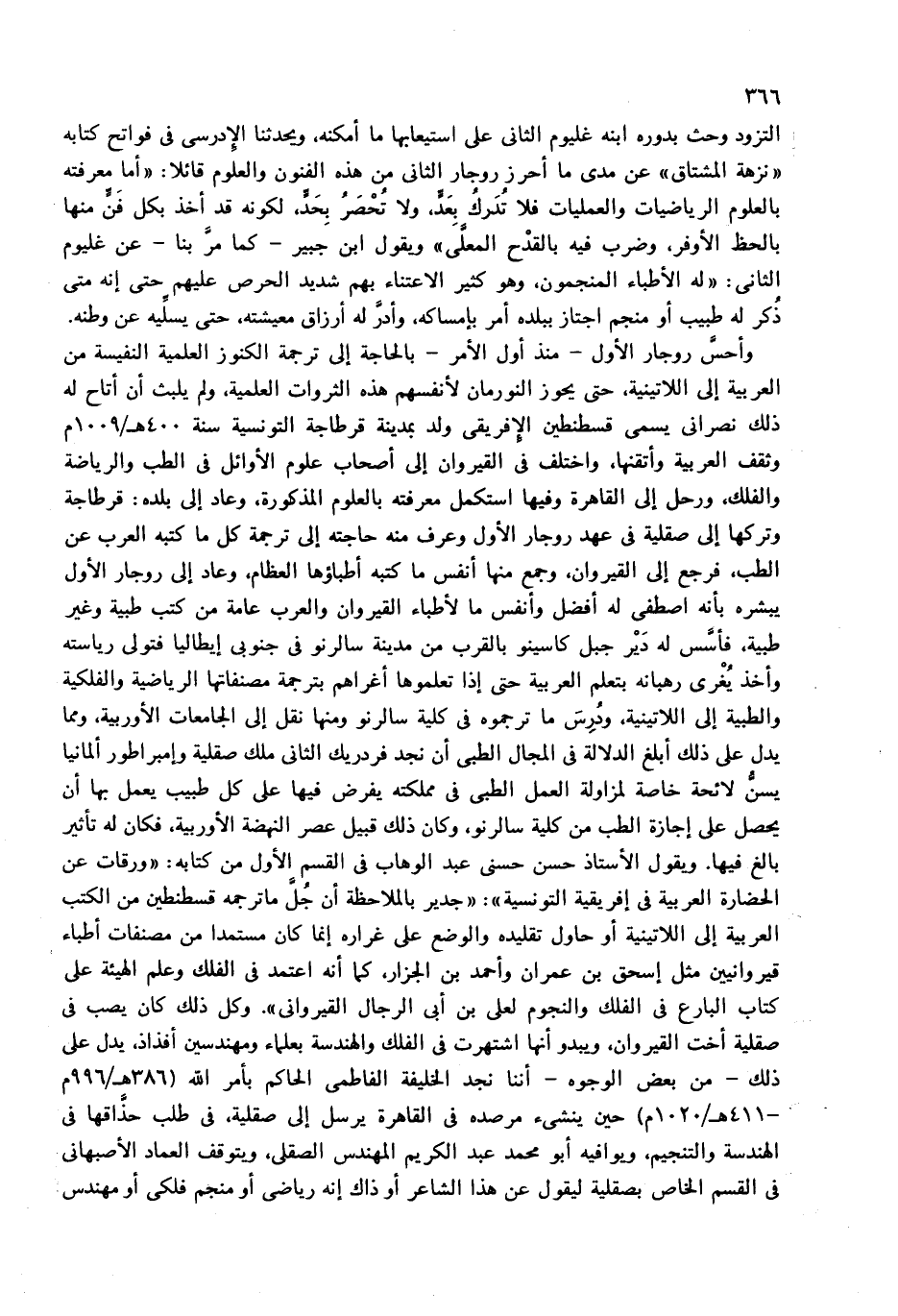 وأحسّ روجار الأول-منذ أول الأمر-بالحاجة إلى ترجمة الكنوز العلمية النفيسة من العربية إلى اللاتينية، حتى يحوز النورمان لأنفسهم هذه الثروات العلمية، ولم يلبث أن أتاح له ذلك نصرانى يسمى قسطنطين الإفريقى ولد بمدينة قرطاجة التونسية سنة 400 هـ/1009 م وثقف العربية وأتقنها، واختلف فى القيروان إلى أصحاب علوم الأوائل فى الطب والرياضة والفلك، ورحل إلى القاهرة وفيها استكمل معرفته بالعلوم المذكورة، وعاد إلى بلده: قرطاجة وتركها إلى صقلية فى عهد روجار الأول وعرف منه حاجته إلى ترجمة كل ما كتبه العرب عن الطب، فرجع إلى القيروان، وجمع منها أنفس ما كتبه أطباؤها العظام، وعاد إلى روجار الأول يبشره بأنه اصطفى له أفضل وأنفس ما لأطباء القيروان والعرب عامة من كتب طبية وغير طبية، فأسّس له دير جبل كاسينو بالقرب من مدينة سالرنو فى جنوبى إيطاليا فتولى رياسته وأخذ يغرى رهبانه بتعلم العربية حتى إذا تعلموها أغراهم بترجمة مصنفاتها الرياضية والفلكية والطبية إلى اللاتينية، ودرس ما ترجموه فى كلية سالرنو ومنها نقل إلى الجامعات الأوربية، ومما يدل على ذلك أبلغ الدلالة فى المجال الطبى أن نجد فردريك الثانى ملك صقلية وإمبراطور ألمانيا يسنّ لائحة خاصة لمزاولة العمل الطبى فى مملكته يفرض فيها على كل طبيب يعمل بها أن يحصل على إجازة الطب من كلية سالرنو، وكان ذلك قبيل عصر النهضة الأوربية، فكان له تأثير بالغ فيها. ويقول الأستاذ حسن حسنى عبد الوهاب فى القسم الأول من كتابه: «ورقات عن الحضارة العربية فى إفريقية التونسية»: «جدير بالملاحظة أن جلّ ما ترجمه قسطنطين من الكتب العربية إلى اللاتينية أو حاول تقليده والوضع على غراره إنما كان مستمدا من مصنفات أطباء قيروانيين مثل إسحاق بن عمران وأحمد بن الجزار، كما أنه اعتمد فى الفلك وعلم الهيئة على كتاب البارع فى الفلك والنجوم لعلى بن أبى الرجال القيروانى». وكل ذلك كان يصب فى صقلية أخت القيروان، ويبدو أنها اشتهرت فى الفلك والهندسة بعلماء ومهندسين أفذاذ، يدل على ذلك-من بعض الوجوه-أننا نجد الخليفة الفاطمى الحاكم بأمر الله (386 هـ/996 م -411 هـ/1020 م) حين ينشئ مرصده فى القاهرة يرسل إلى صقلية، فى طلب حذّاقها فى الهندسة والتنجيم، ويوافيه أبو محمد عبد الكريم المهندس الصقلى، ويتوقف العماد الأصبهانى فى القسم الخاص بصقلية ليقول عن هذا الشاعر أو ذاك إنه رياضى أو منجم فلكى أو مهندس
