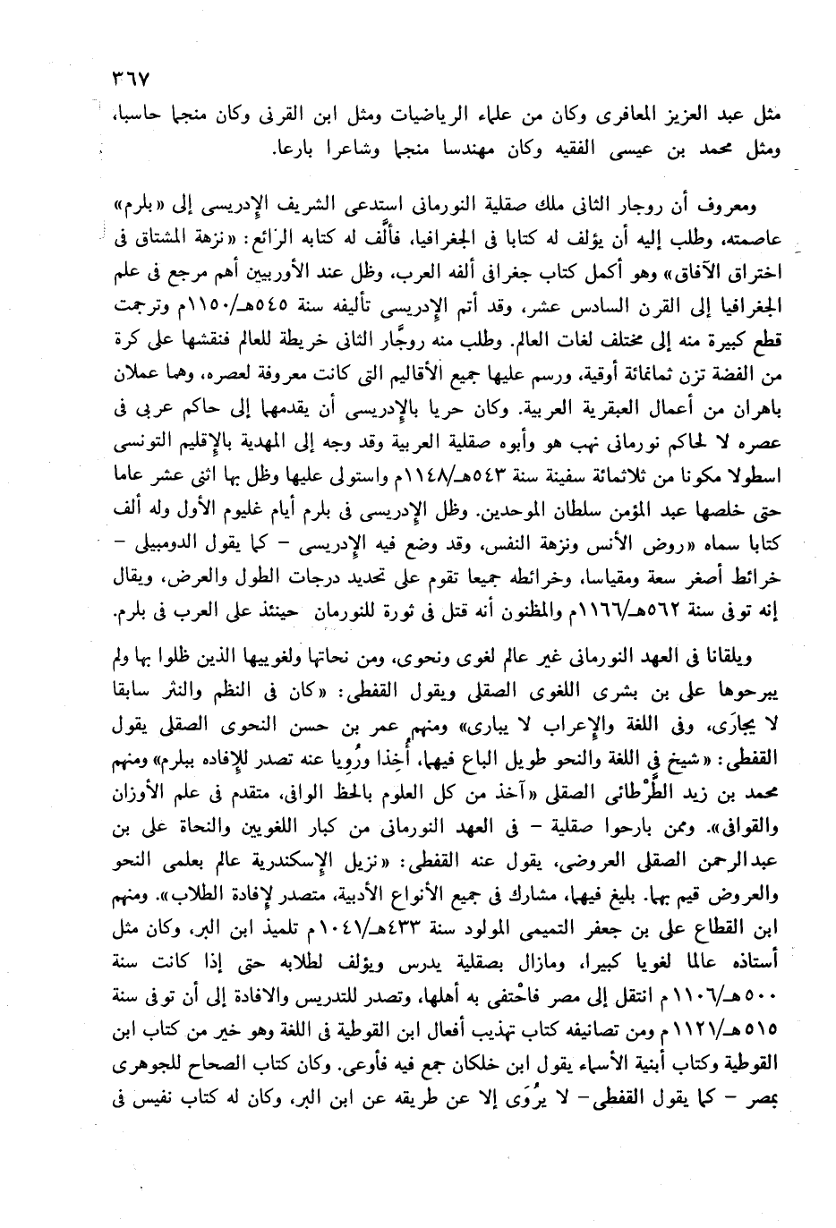 ومعروف أن روجار الثانى ملك صقلية النورمانى استدعى الشريف الإدريسى إلى «بلرم» عاصمته، وطلب إليه أن يؤلف له كتابا فى الجغرافيا، فألّف له كتابه الرائع: «نزهة المشتاق فى اختراق الآفاق» وهو أكمل كتاب جغرافى ألفه العرب، وظل عند الأوربيين أهم مرجع فى علم الجغرافيا إلى القرن السادس عشر، وقد أتم الإدريسى تأليفه سنة 545 هـ/1150 م وترجمت قطع كبيرة منه إلى مختلف لغات العالم. وطلب منه روجّار الثانى خريطة للعالم فنقشها على كرة من الفضة تزن ثمانمائة أوقية، ورسم عليها جميع الأقاليم التى كانت معروفة لعصره، وهما عملان باهران من أعمال العبقرية العربية. وكان حريا بالإدريسى أن يقدمهما إلى حاكم عربى فى عصره لا لحاكم نورمانى نهب هو وأبوه صقلية العربية وقد وجه إلى المهدية بالإقليم التونسى اسطولا مكونا من ثلاثمائة سفينة سنة 543 هـ/1148 م واستولى عليها وظل بها اثنى عشر عاما حتى خلصها عبد المؤمن سلطان الموحدين. وظل الإدريسى فى بلرم أيام غليوم الأول وله ألف كتابا سماه «روض الأنس ونزهة النفس، وقد وضع فيه الإدريسى-كما يقول الدومبيلى- خرائط أصغر سعة ومقياسا، وخرائطه جميعا تقوم على تحديد درجات الطول والعرض، ويقال إنه توفى سنة 562 هـ/1166 م والمظنون أنه قتل فى ثورة للنورمان حينئذ على العرب فى بلرم.