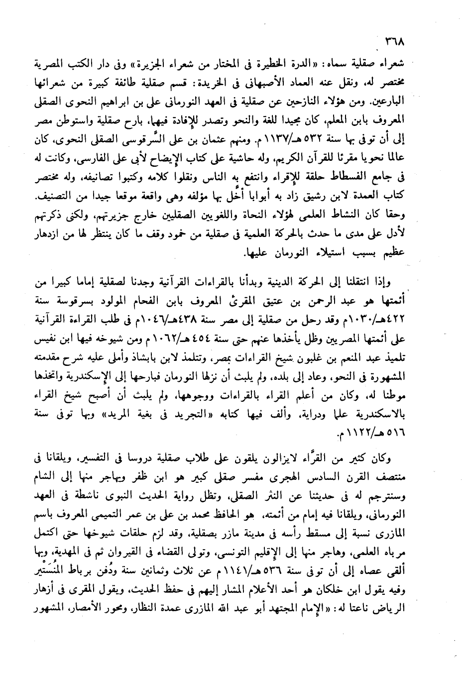 وكان كثير من القرّاء لا يزالون يلقون على طلاب صقلية دروسا فى التفسير، ويلقانا فى منتصف القرن السادس الهجرى مفسر صقلى كبير هو ابن ظفر ويهاجر منها إلى الشام وسنترجم له فى حديثنا عن النثر الصقلى، وتظل رواية الحديث النبوى ناشطة فى العهد النورمانى، ويلقانا فيه إمام من أئمته، هو الحافظ محمد بن على بن عمر التميمى المعروف باسم المازرى نسبة إلى مسقط رأسه فى مدينة مازر بصقلية، وقد لزم حلقات شيوخها حتى اكتمل مرباه العلمى، وهاجر منها إلى الإقليم التونسى، وتولى القضاء فى القيروان ثم فى المهدية، وبها ألقى عصاه إلى أن توفى سنة 536 هـ/1141 م عن ثلاث وثمانين سنة ودفن برباط المنستير وفيه يقول ابن خلكان هو أحد الأعلام المشار إليهم فى حفظ الحديث، ويقول المقرى فى أزهار الرياض ناعتا له: «الإمام المجتهد أبو عبد الله المازرى عمدة النظار، ومحور الأمصار، المشهور