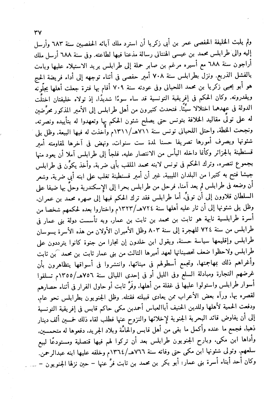 ولم يلبث الخليفة الحفصى عمر بن أبى زكريا أن استرد ملك آبائه الحفصيين سنة 683 وأرسل إليه والى طرابلس محمد بن عيسى الهنتانى رسالة مذعنا فيها لطاعته. وفى سنة 688 أرسل ملك أراجون سنة 688 مع أسيره مرغم بن صابر حملة إلى طرابلس يريد الاستيلاء عليها وباءت بالفشل الذريع. ونزل بطرابلس سنة 708 أمير حفصى فى أثناء توجهه إلى أداء فريضة الحج هو أبو يحيى زكريا بن محمد اللحيانى وفى عودته سنة 709 أقام بها فترة جعلت أهلها يجلّونه ويقدرونه. وكان الحكم فى إفريقية التونسية قد ساء سوءا شديدا، إذ تولاه خليفتان اختلّت الدولة فى عهدهما اختلالا سيّئا. فتحدث كثيرون من أهل طرابلس إلى الأمير المذكور محرّضين له على تولّى مقاليد الخلافة بتونس حتى يصلح شئون الحكم بها وتعهدوا له بتأييده ونصرته، ونجحت الخطة، واحتل اللحيانى تونس سنة 711 هـ/1311 م وأخذت له فيها البيعة، وظل يلى شئونها ويصرف أمورها تصريفا حسنا لمدة ست سنوات، ونهض فى آخرها لمقاومته أمير قسنطينة بالجزائر وكأنما داخله اليأس من الانتصار عليه، فلجأ إلى طرابلس آملا أن يعود منها بجموع تنصره، وترك الحكم فى تونس لابنه محمد الملقب بأبى ضربة، وأخذ يكوّن فى طرابلس جيشا فتح به كثيرا من البلدان الليبية، غير أن أمير قسنطينة تغلب على ابنه أبى ضرية، وشعر أن وضعه فى طرابلس لم يعد آمنا، فرحل من طرابلس بحرا إلى الإسكندرية وحلّ بها ضيفا على السلطان قلاوون إلى أن توفّى، أما طرابلس فقد ترك الحكم فيها إلى صهره محمد بن عمران، وظل يلى شئونها إلى أن ثار عليه أهلها سنة 724 هـ/1323 م واختاروا بعده لحكمهم شخصا من أسرة طرابلسية نابهة هو ثابت بن محمد بن ثابت بن عمار، وبه تأسست دولة بنى عمار فى طرابلس من سنة 724 للهجرة إلى سنة 803 وظل الأميران الأولان من هذه الأسرة يسوسان طرابلس وإقليمها سياسة حسنة، ويقول ابن خلدون إن تجارا من جنوة كانوا يترددون على طرابلس ولاحظوا ضعف تحصيناتها لعهد أميرها الثالث من بنى عمار ثابت بن محمد بن ثابت وأغراهم ذلك بمهاجمتها، وتجمع أسطولهم فى مينائها، وانتشروا فى أسواقها يتظاهرون بأن غرضهم التجارة ومبادلة السلع وفى الليل أو فى إحدى الليالى سنة 756 هـ/1355 م تسلقوا أسوار طرابلس واستولوا عليها فى غفلة من أهلها، وفرّ ثابت أو حاول الفرار فى أثناء حصارهم لقصره بها، ورآه بعض الأعراب ممن يعادى قبيلته فقتله. وظل الجنويون بطرابلس نحو عام، ودفعت الحمية لأهلها وللدين الحنيف أبا العباس أحمد بن مكى حاكم قابس فى إفريقية التونسية إلى أن يفاوض قائد البحرية الجنوية لإخلائها والنزوح عنها فطلب لقاء ذلك خمسين ألف دينار ذهبا، فجمع ما عنده وأكمل ما بقى من أهل قابس والحامّة وبلاد الجريد، دفعوها له متحمسين، وأداها ابن مكى، وبارح الجنويون طرابلس بعد أن تركوا لهم فيها قنصلية ومستودعا لبيع سلعهم. وتولى شئونها ابن مكى حتى وفاته سنة 766 هـ/1364 م وخلفه عليها ابنه عبد الرحمن.