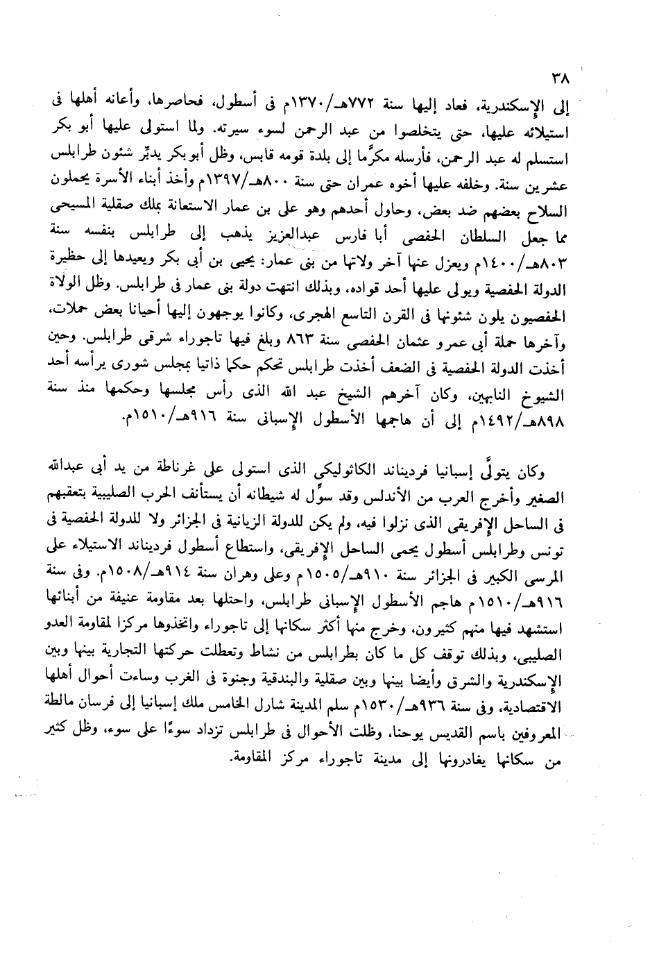 إلى الإسكندرية، فعاد إليها سنة 772 هـ/1370 م فى أسطول، فحاصرها، وأعانه أهلها فى استيلائه عليها، حتى يتخلصوا من عبد الرحمن لسوء سيرته. ولما استولى عليها أبو بكر استسلم له عبد الرحمن، فأرسله مكرّما إلى بلدة قومه قابس، وظل أبو بكر يدبّر شئون طرابلس عشرين سنة. وخلفه عليها أخوه عمران حتى سنة 800 هـ/1397 م وأخذ أبناء الأسرة يحملون السلاح بعضهم ضد بعض، وحاول أحدهم وهو على بن عمار الاستعانة بملك صقلية المسيحى مما جعل السلطان الحفصى أبا فارس عبد العزيز يذهب إلى طرابلس بنفسه سنة 803 هـ/1400 م ويعزل عنها آخر ولاتها من بنى عمار: يحيى بن أبى بكر ويعيدها إلى حظيرة الدولة الحفصية ويولى عليها أحد قواده، وبذلك انتهت دولة بنى عمار فى طرابلس. وظل الولاة الحفصيون يلون شئونها فى القرن التاسع الهجرى، وكانوا يوجهون إليها أحيانا بعض حملات، وآخرها حملة أبى عمرو عثمان الحفصى سنة 863 وبلغ فيها تاجوراء شرقى طرابلس. وحين أخذت الدولة الحفصية فى الضعف أخذت طرابلس تحكم حكما ذاتيا بمجلس شورى يرأسه أحد الشيوخ النابهين، وكان آخرهم الشيخ عبد الله الذى رأس مجلسها وحكمها منذ سنة 898 هـ/1492 م إلى أن هاجمها الأسطول الإسبانى سنة 916 هـ/1510 م.