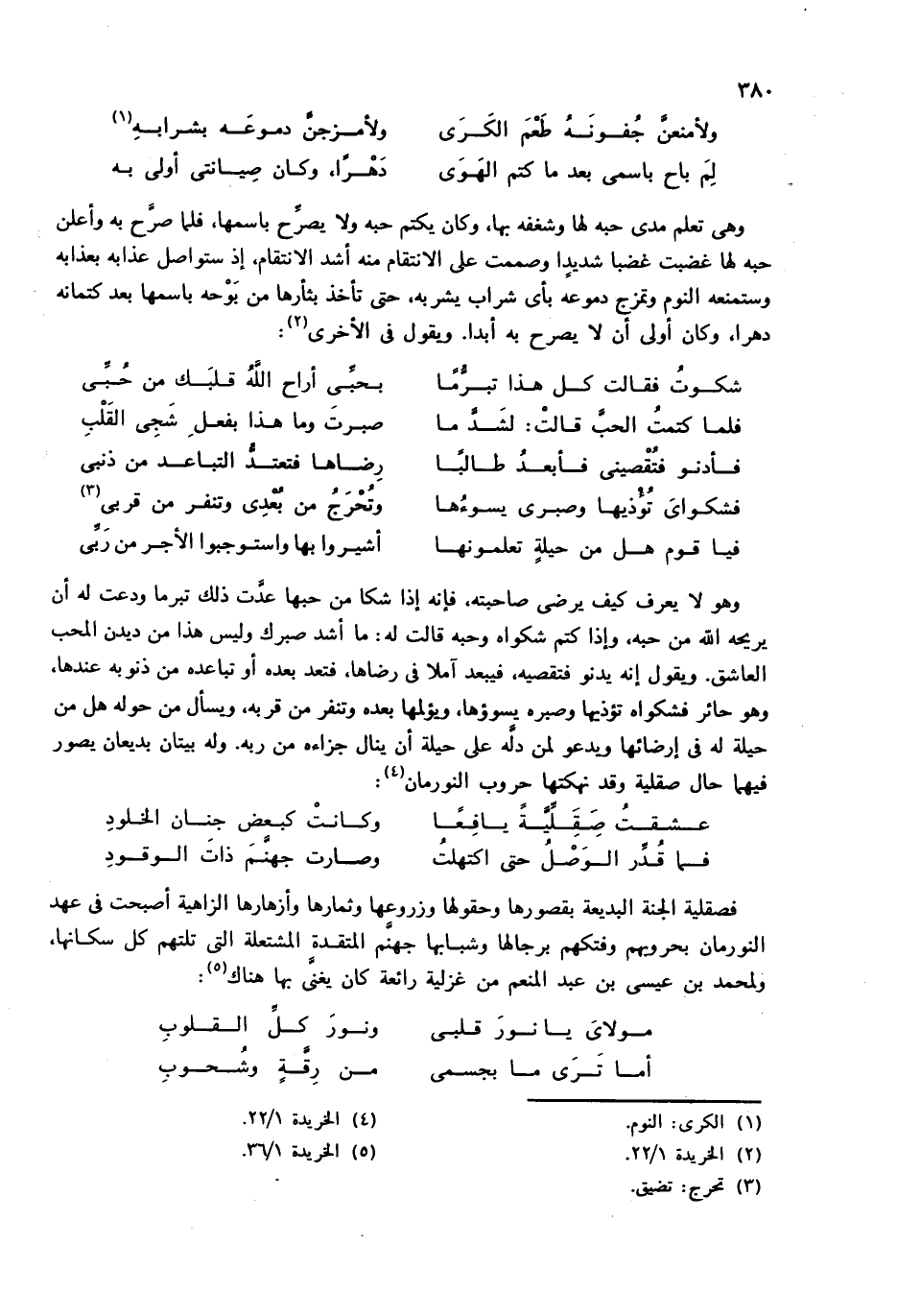 وهى تعلم مدى حبه لها وشغفه بها، وكان يكتم حبه ولا يصرّح باسمها، فلما صرّح به وأعلن حبه لها غضبت غضبا شديدا وصممت على الانتقام منه أشد الانتقام، إذ ستواصل عذابه بعذابه وستمنعه النوم وتمزج دموعه بأى شراب يشربه، حتى تأخذ بثأرها من بوحه باسمها بعد كتمانه دهرا، وكان أولى أن لا يصرح به أبدا. ويقول فى الأخرى (¬2):