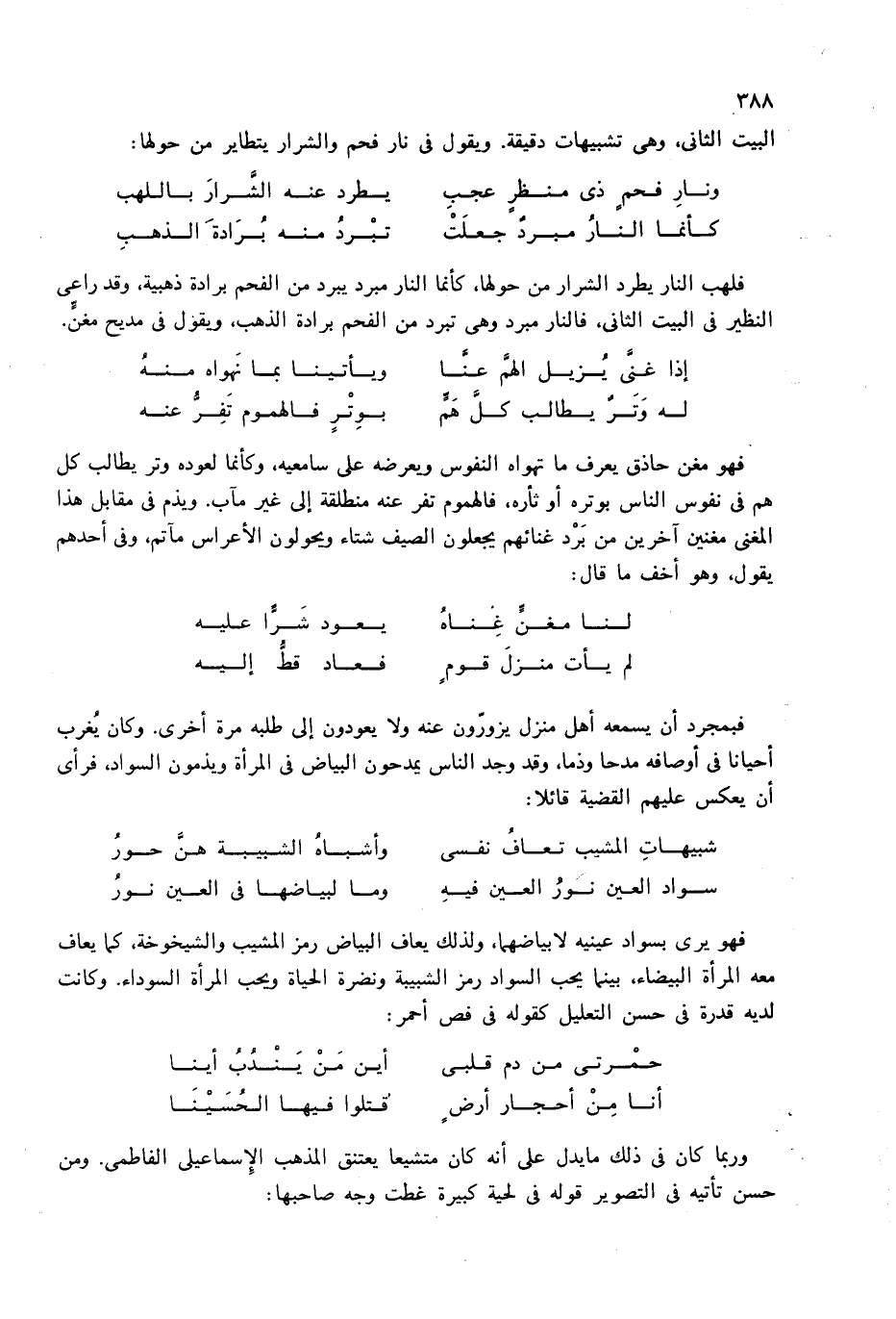 وربما كان فى ذلك ما يدل على أنه كان متشيعا يعتنق المذهب الإسماعيلى الفاطمى. ومن حسن تأتيه فى التصوير قوله فى لحية كبيرة غطت وجه صاحبها: