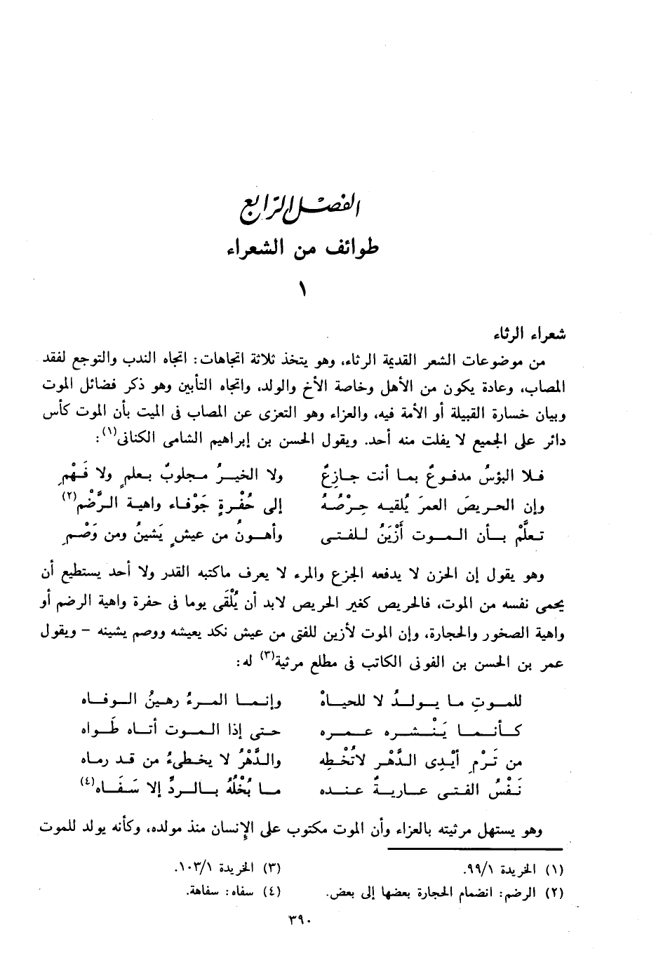 وهو يقول إن الحزن لا يدفعه الجزع والمرء لا يعرف ما كتبه القدر ولا أحد يستطيع أن يحمى نفسه من الموت، فالحريص كغير الحريص لا بد أن يلقى يوما فى حفرة واهية الرضم أو واهية الصخور والحجارة، وإن الموت لأزين للفتى من عيش نكد يعيشه ووصم يشينه-ويقول عمر بن الحسن بن الفونى الكاتب فى مطلع مرثية (¬3) له: