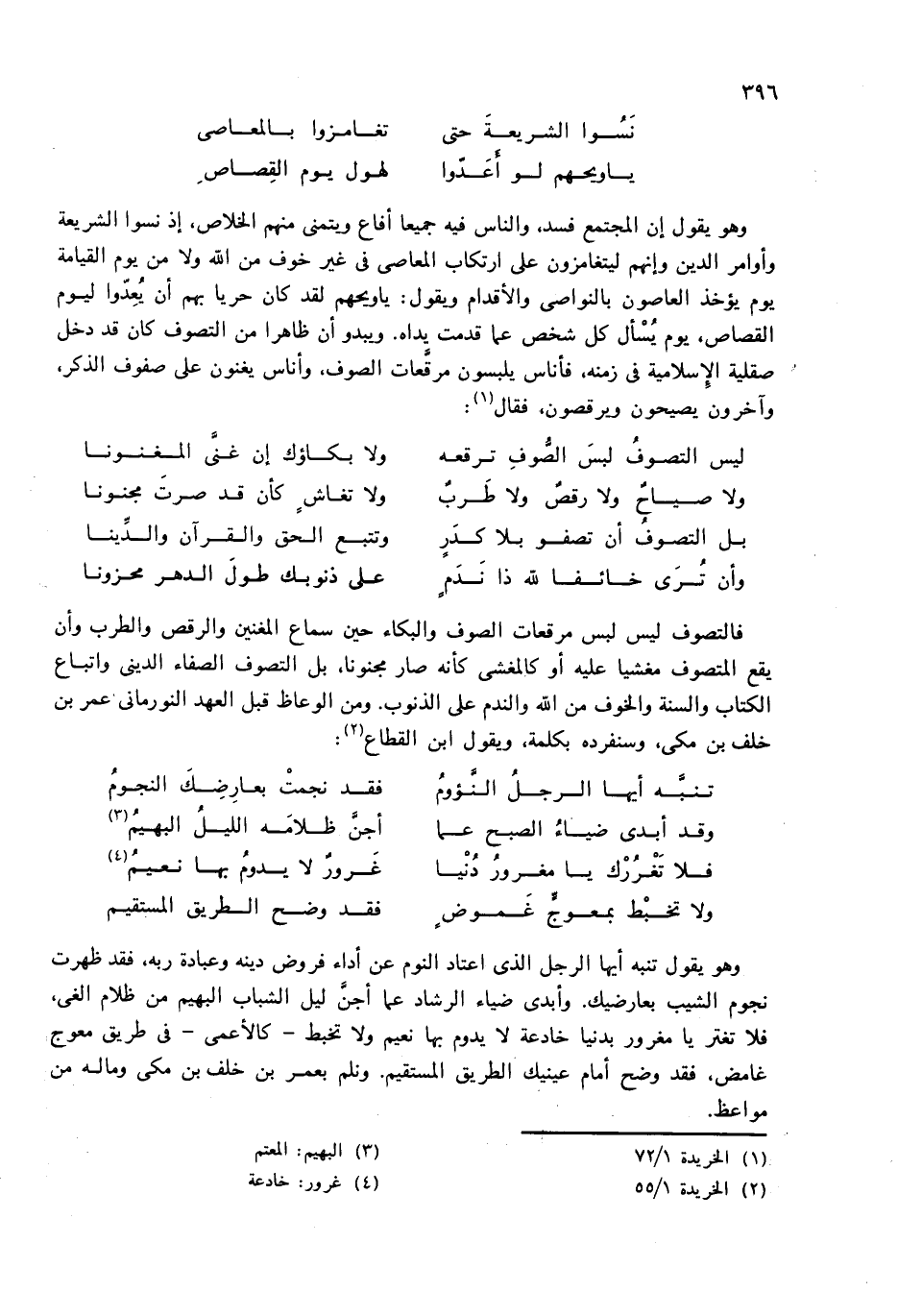 وهو يقول تنبه أيها الرجل الذى اعتاد النوم عن أداء فروض دينه وعبادة ربه، فقد ظهرت نجوم الشيب بعارضيك. وأبدى ضياء الرشاد عما أجنّ ليل الشباب البهيم من ظلام الغى، فلا تغتر يا مغرور بدنيا خادعة لا يدوم بها نعيم ولا تخبط-كالأعمى-فى طريق معوج غامض، فقد وضح أمام عينيك الطريق المستقيم. ونلم بعمر بن خلف بن مكى وماله من مواعظ.