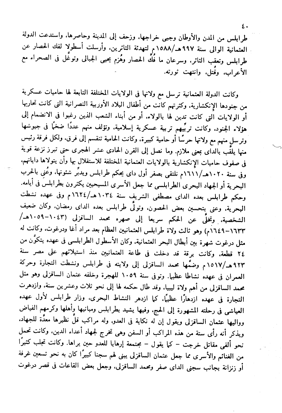 وحكم طرابلس بعده الداى مصطفى الشريف سنة 1034 هـ/1624 م وفى عهده نشطت البحرية، وعنى بتحسين بعض الحصون، وتولّى طرابلس بعده الداى رمضان، وكان ضعيف الشخصية، وتخلّى عن الحكم سريعا إلى صهره محمد الساقزلى (1043 - 1059 هـ/ 1633 - 1649 م) وهو ثالث ولاة طرابلس العثمانيين العظام بعد مراد أغا ودرغوت، وكانت له مثل درغوت شهرة بين أبطال البحر العثمانية، وكان الأسطول الطرابلسى فى عهده يتكوّن من 24 قطعة، وكانت برقة قد دخلت فى طاعة العثمانيين منذ استيلائهم على مصر سنة 923 هـ/1517 م وضمّها محمد الساقزلى إلى ولايته فى طرابلس ونشطت التجارة وحركة العمران فى عهده نشاطا عظيما. وتوفى سنة 1059 للهجرة وخلفه عثمان الساقزلى وهو مثل محمد الساقزلى من أهم ولاة ليبيا، وقد طال حكمه لها إلى نحو ثلاث وعشرين سنة، وازدهرت التجارة فى عهده ازدهارا عظيما، كما ازدهر النشاط البحرى، وزار طرابلس لأول عهده العياشى فى رحلته المشهورة إلى الحج، وفيها يشيد بطرابلس ومبانيها وأهلها وكرمهم الفياض وواليها عثمان الساقزلى ويقول إن له نكاية فى العدو، وله مراكب قلّ نظيرها معدّة للجهاد، ويذكر أنه رأى ستة من هذه المراكب أو السفن وهى تخرج لجهاد أعداء الدين، وكانت تحمل نحو ألفى مقاتل خرجت-كما يقول-مجتمعة إرهابا للعدو حين يراها. وكانت تجلب كثيرا من الغنائم والأسرى مما جعل عثمان الساقزلى يبنى لهم سجنا كبيرا كان به نحو تسعين غرفة أو زنزانة بجانب سجنى الداى صفر ومحمد الساقزلى، وجعل بعض القاعات فى قصر درغوت