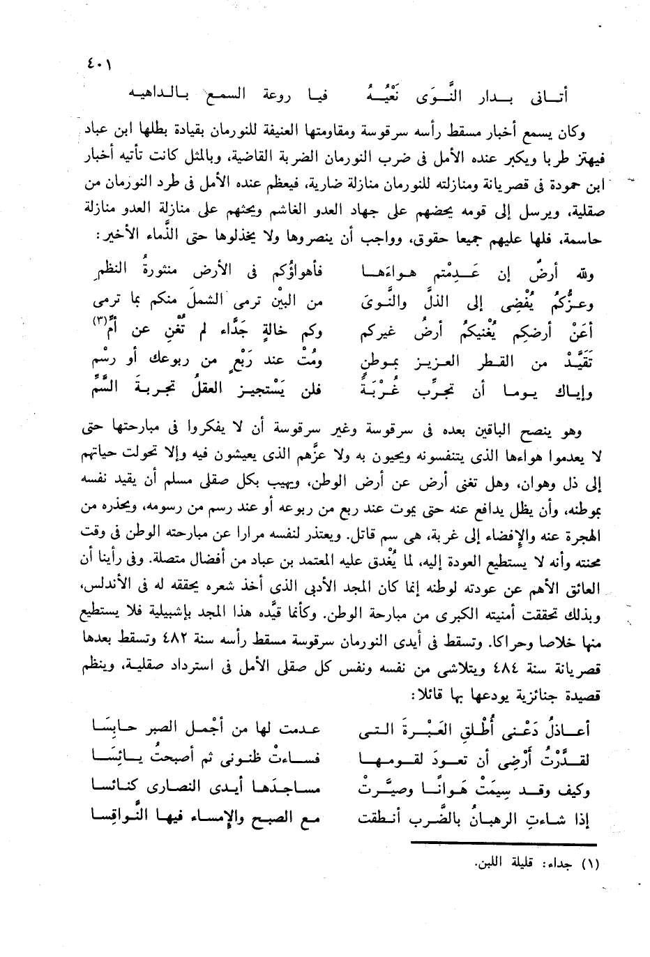 وهو ينصح الباقين بعده فى سرقوسة وغير سرقوسة أن لا يفكروا فى مبارحتها حتى لا يعدموا هواءها الذى يتنفسونه ويحيون به ولا عزّهم الذى يعيشون فيه وإلا تحولت حياتهم إلى ذل وهوان، وهل تغنى أرض عن أرض الوطن، ويهيب بكل صقلى مسلم أن يقيد نفسه بموطنه، وأن يظل يدافع عنه حتى يموت عند ربع من ربوعه أو عند رسم من رسومه، ويحذره من الهجرة عنه والإفضاء إلى غربة، هى سم قاتل. ويعتذر لنفسه مرارا عن مبارحته الوطن فى وقت محنته وأنه لا يستطيع العودة إليه، لما يغدق عليه المعتمد بن عباد من أفضال متصلة. وفى رأينا أن العائق الأهم عن عودته لوطنه إنما كان المجد الأدبى الذى أخذ شعره يحققه له فى الأندلس، وبذلك تحققت أمنيته الكبرى من مبارحة الوطن. وكأنما قيّده هذا المجد بإشبيلية فلا يستطيع منها خلاصا وحراكا. وتسقط فى أيدى النورمان سرقوسة مسقط رأسه سنة 482 وتسقط بعدها قصريانة سنة 484 ويتلاشى من نفسه ونفس كل صقلى الأمل فى استرداد صقلية، وينظم قصيدة جنائزية يودعها بها قائلا: